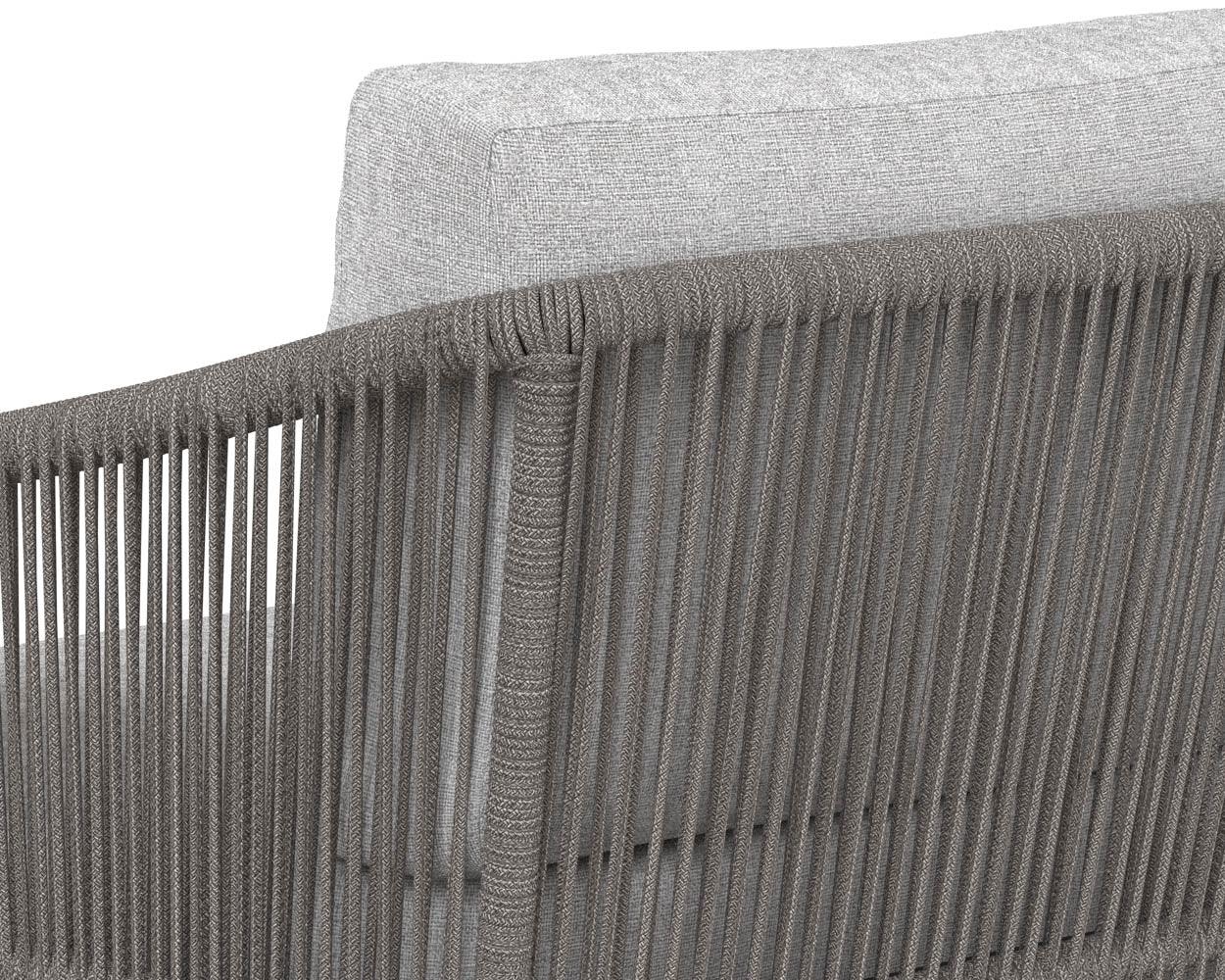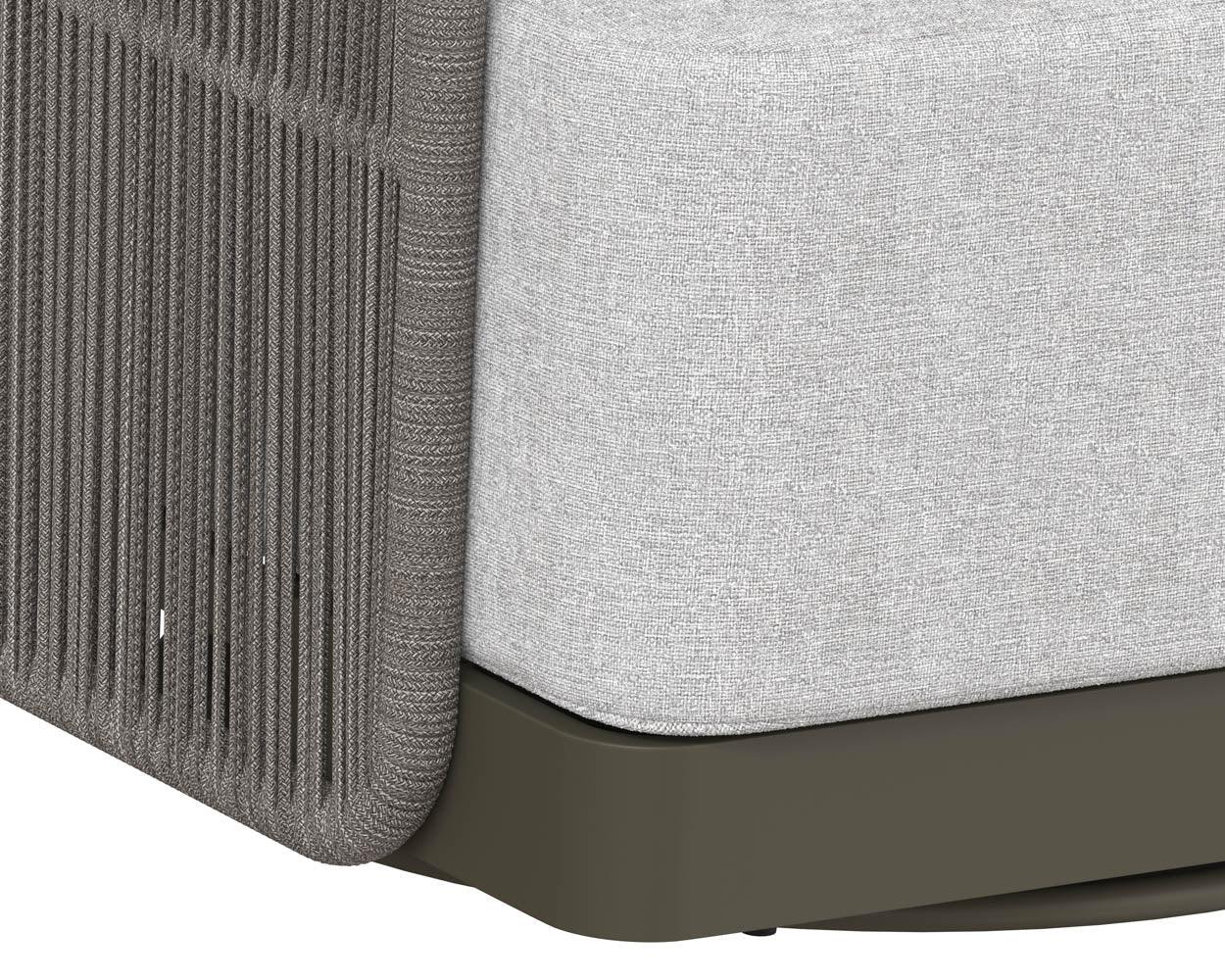 Introduce refined modern style outside with this impressive swivel armchair from the Outdoor by SUNPAN collection. Upholstered in stinston white fabric with a powder coated greige aluminum frame. Completed with cream rope weaving on the seat exterior. Also available in gracebay light grey fabric with a warm grey aluminum frame. Pair with Allariz sofa to complete the look.