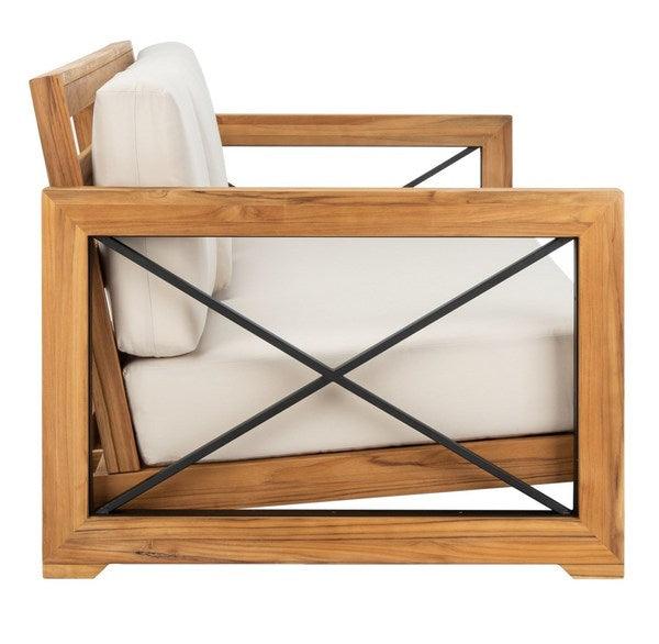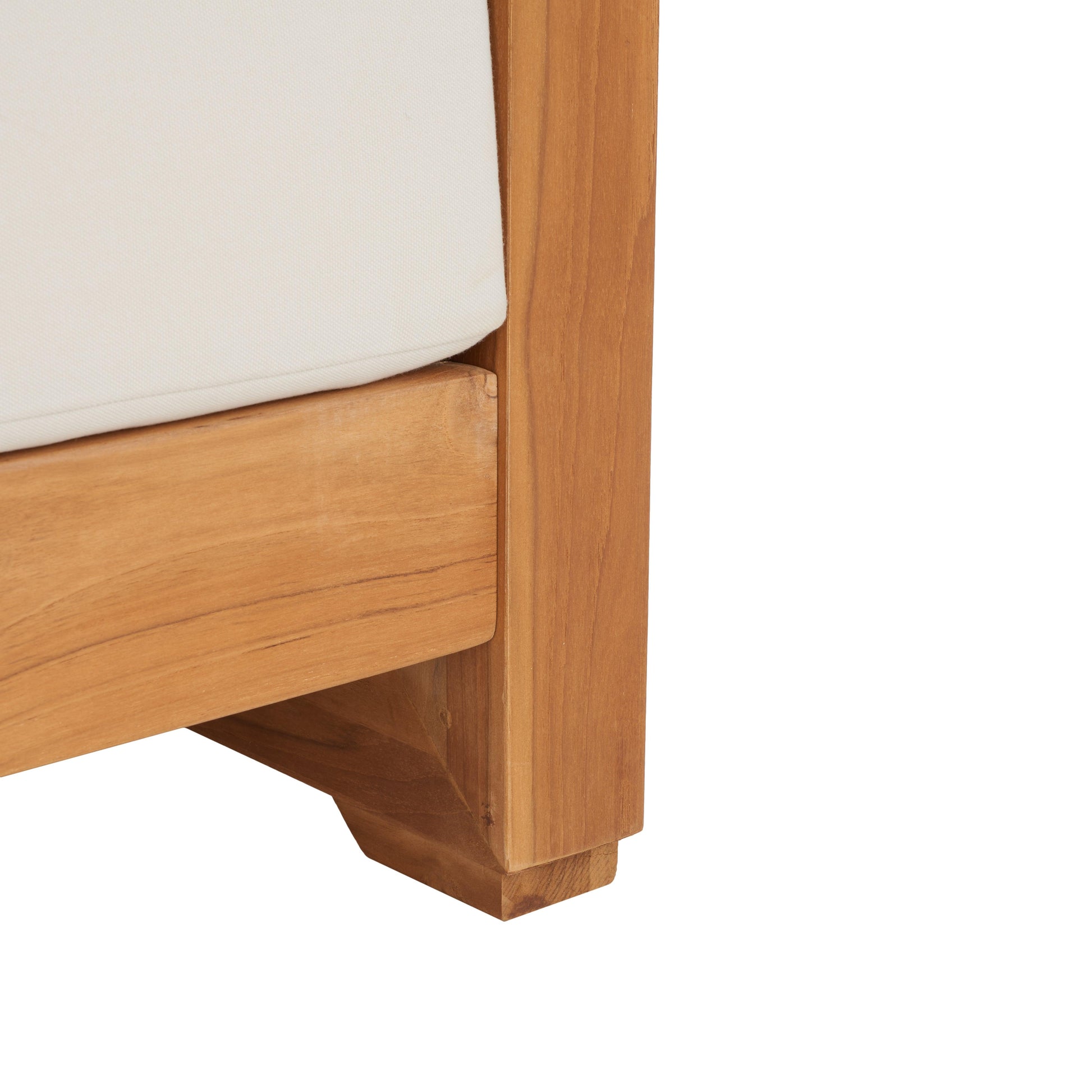 An artful exhibit of mixed-medium decor, the Andros Brazilian Teak Patio Sofa blends modern metal details with coastal-cool Brazilian teak wood construction. This urbane patio chair is roomy-wide with an open-air feel from its exposed metal sides. Plush cream cushions soften the look with an invitation to relax and enjoy your surroundings.