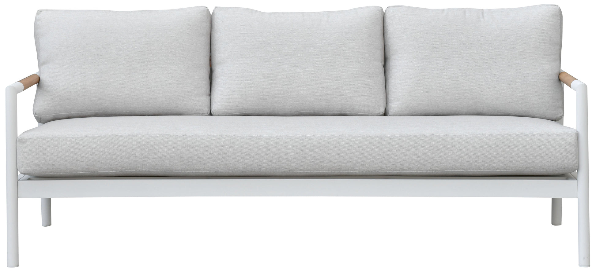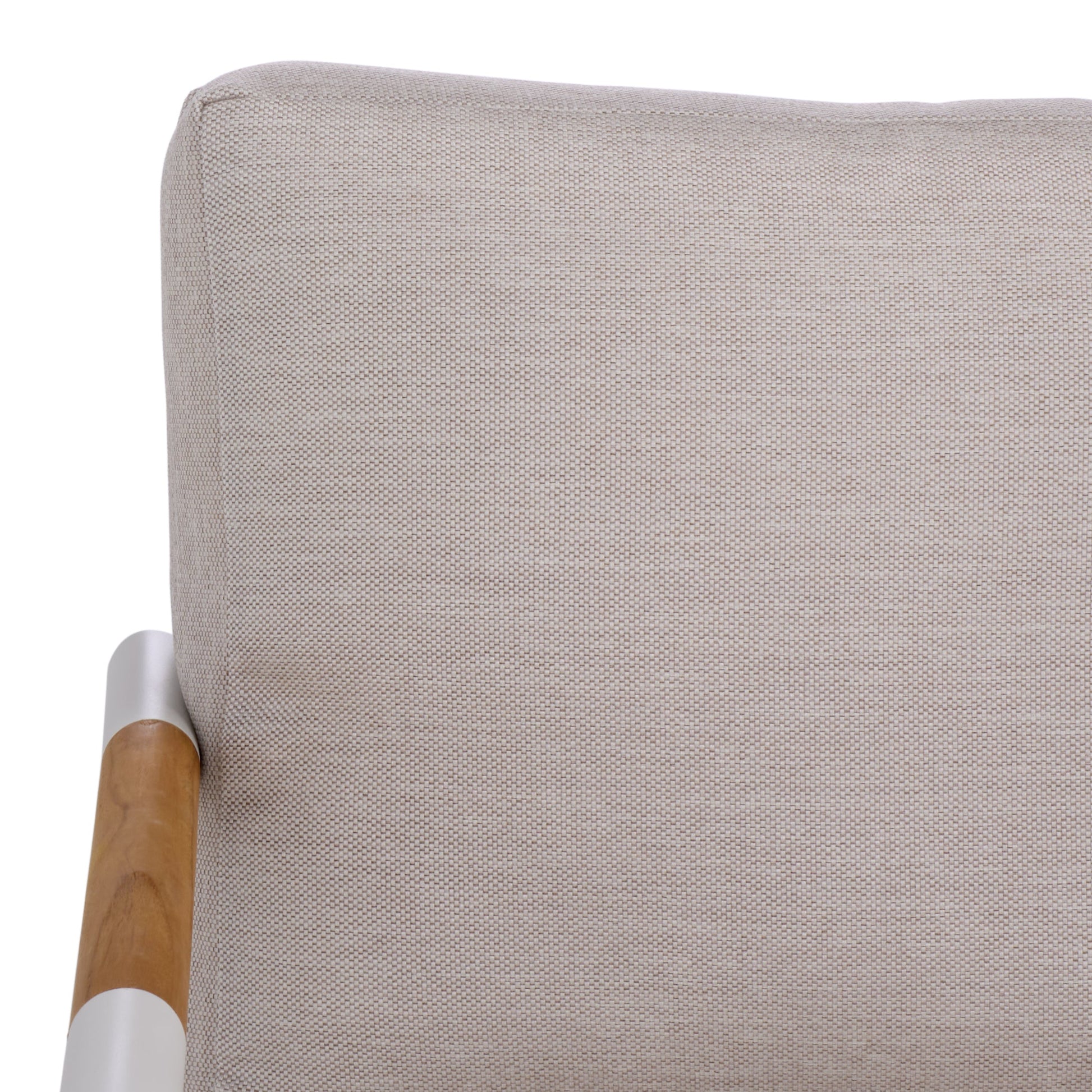 Transform your outdoor space with the Chryssa aluminum and teak patio sofa in white and beige. This elegant piece combines the sleek lines of metal with the warm touch of wood, wrapped in inviting fabric and cozy foam. The soothing color palette of white and beige blends effortlessly into any setting, providing a perfect backdrop for relaxation or social gatherings. The sturdy construction ensures that this sofa delivers both comfort and style. Complement your garden or patio with a sofa that speaks of calm elegance and functional design. Enjoy leisure and create memories with a touch of sophistication in every detail.
