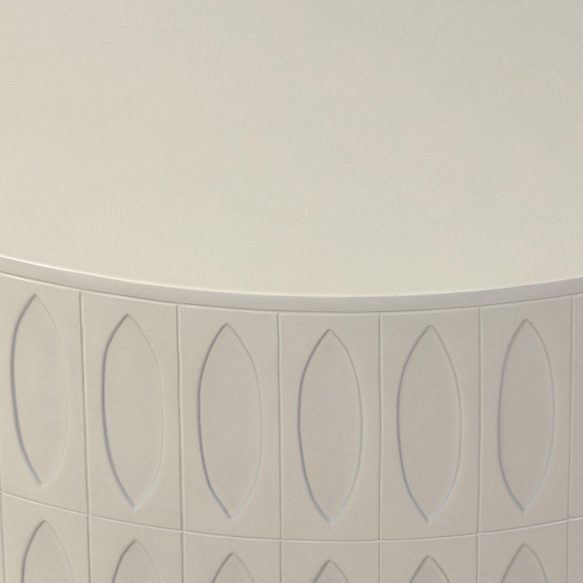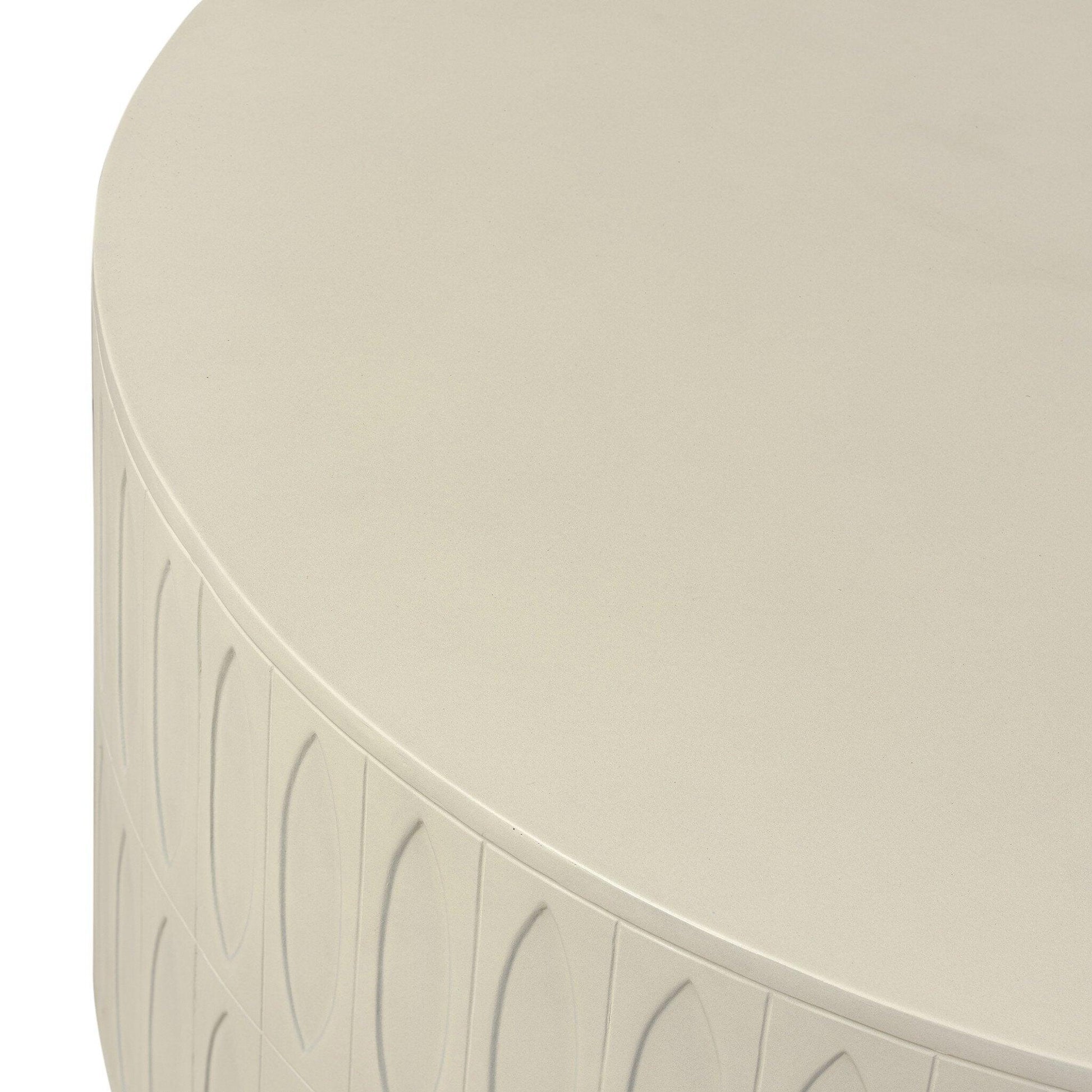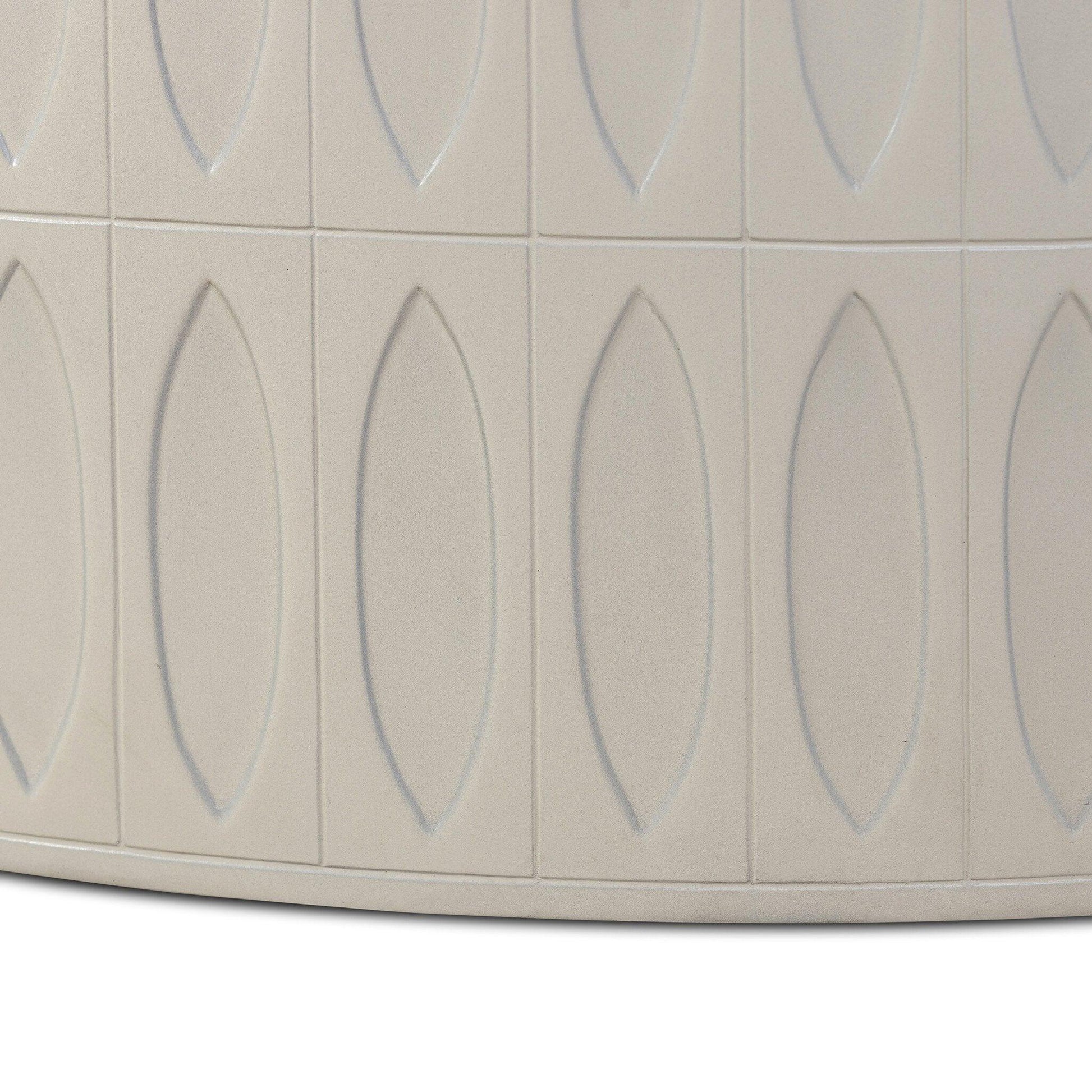 Concrete adopts alluring shapes as modern geometrics play with nature's petal form. A hollowed drum of concrete is intricately etched for artistic intrigue. Safe indoors or out. Cover or store indoors during inclement weather or when not in use. Our Weatherproof Outdoor Round Coffee Table Cover in size medium fits this table.