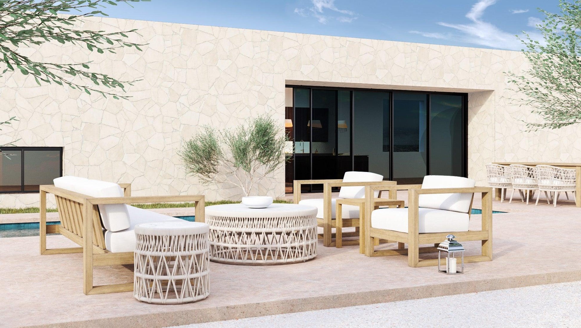 The Dana End Table is the perfect balance between intricate pattern and organic lines. This table features a honed natural Carrara marble top, and expertly wrapped base in premium all-weather olefin rope in natural Linen color.