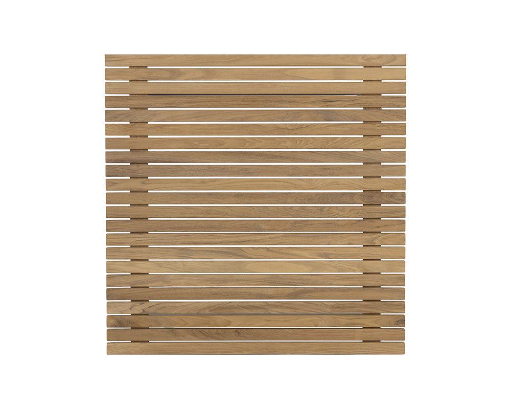 Appreciate warmth and sunlight while seated in an outdoor dining space inspired by the Arizona desert. This modern coffee table features a powder coated aluminum base with a natural teak wood top. Teak wood will develop a silver-grey finish over time. Teak wood has a high oil content that enables its outdoor resistant properties. These natural oils may surface and potentially leave teak marks on fabrics upon contact, which can be easily washed away. Visit our Product Care page for more information on how to ensure the lasting beauty of this piece. As wood is an organic, porous material, these pieces will contain natural variations of texture and may also exhibit fine indentations and cracks. Wood pieces will also display a disparity of colour and grain, and visible knots and burls that add to the character of each piece.
