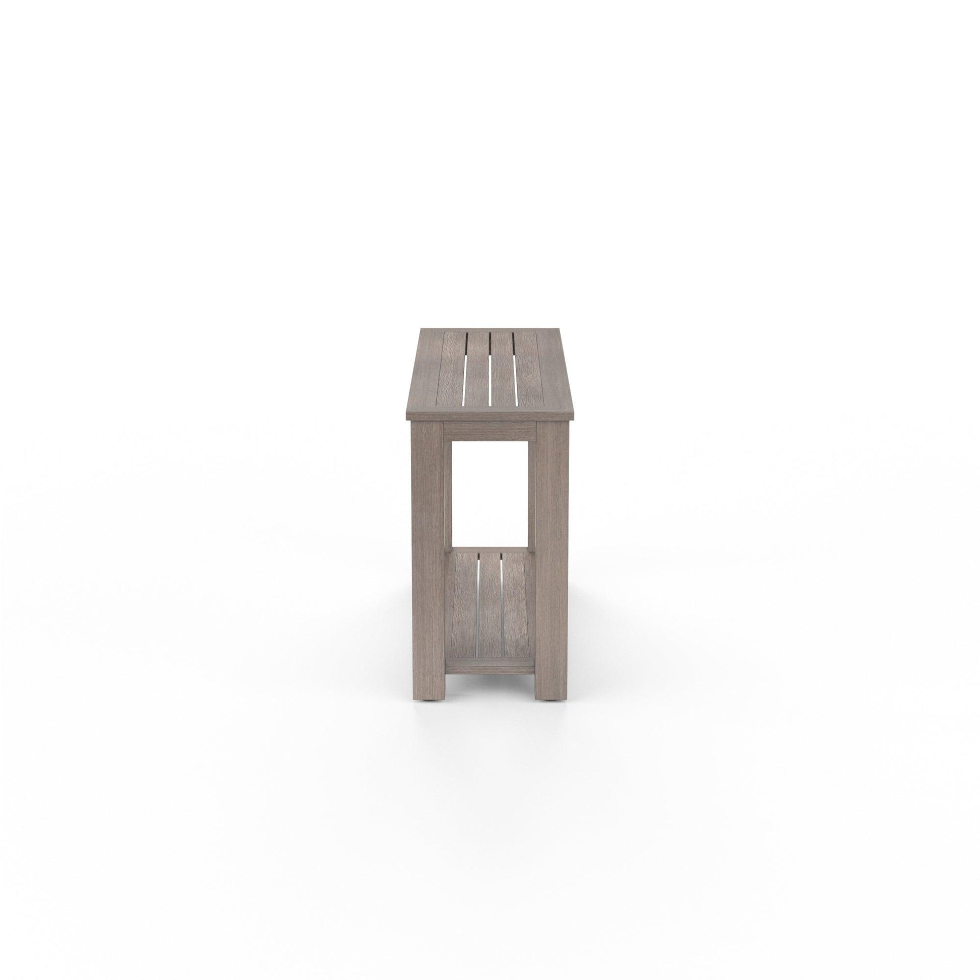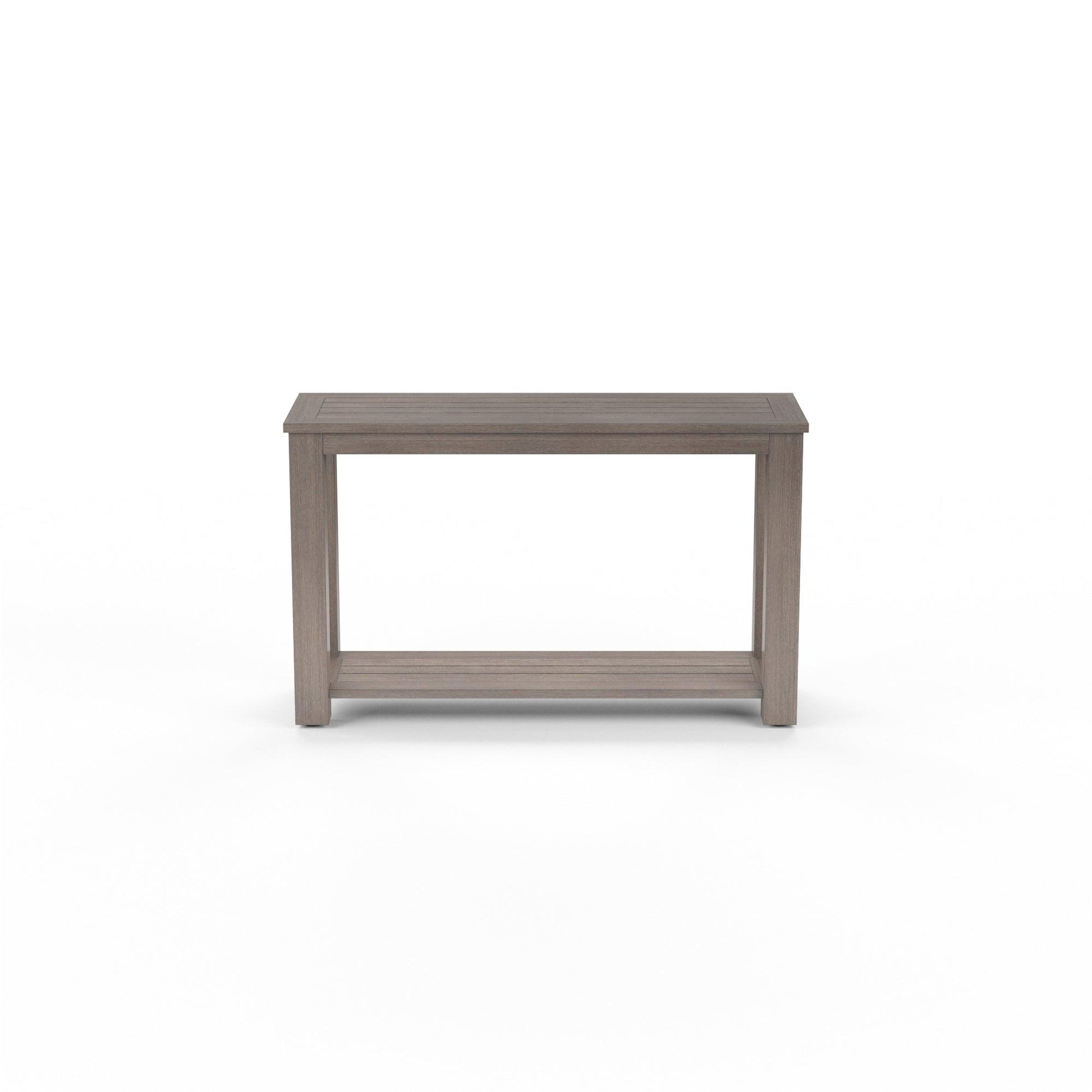 The Laguna Sofa Table is styled with tailored plank top and block legs in our signature driftwood finish.