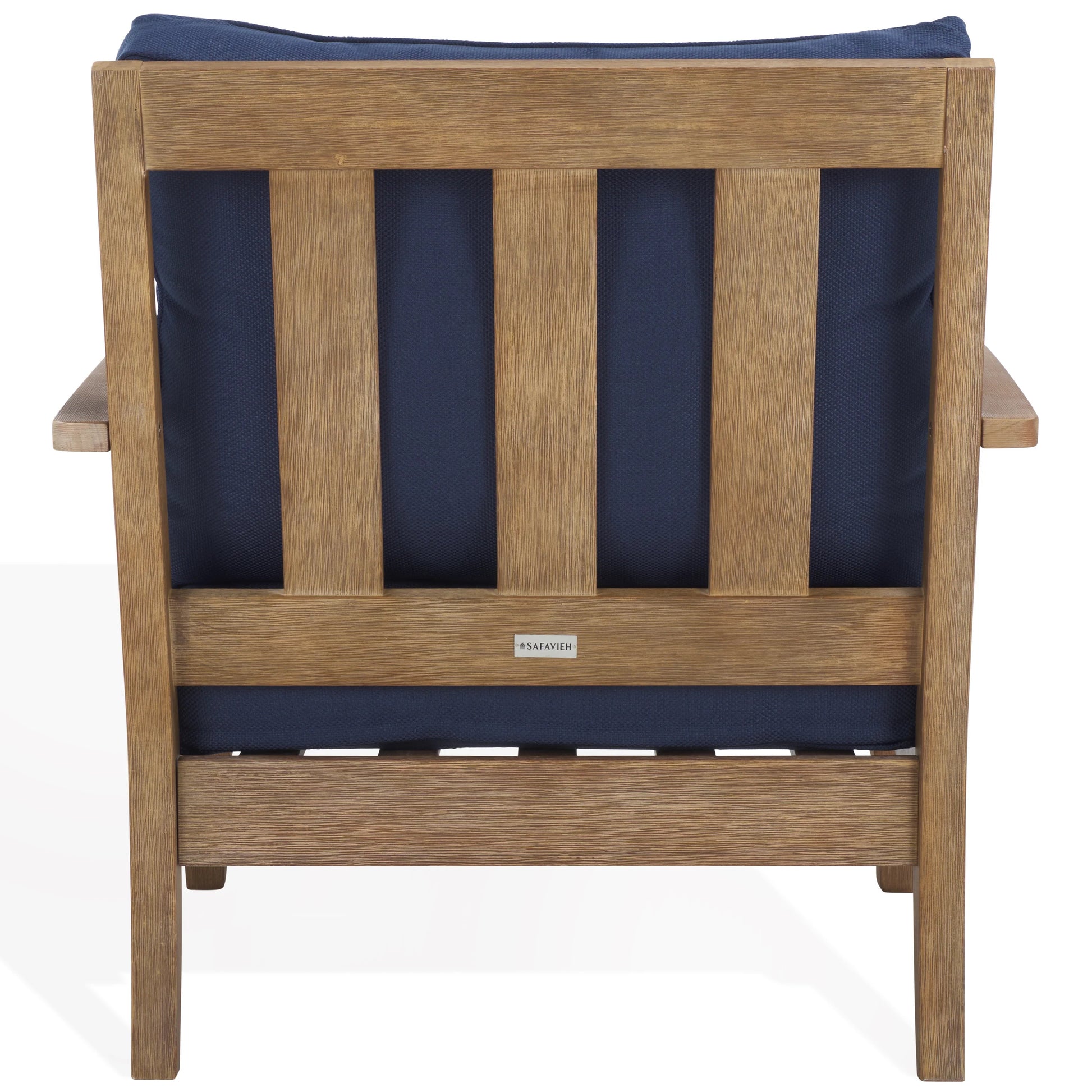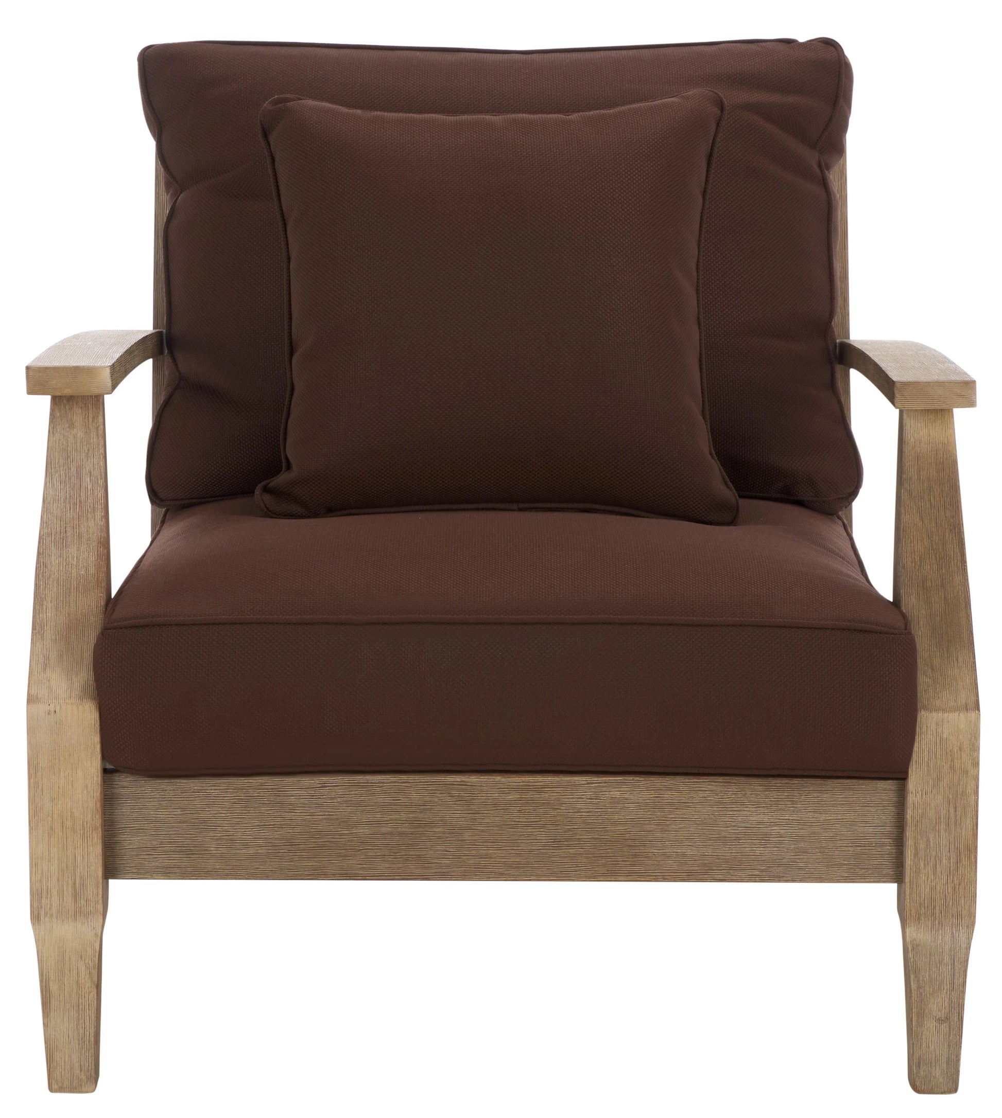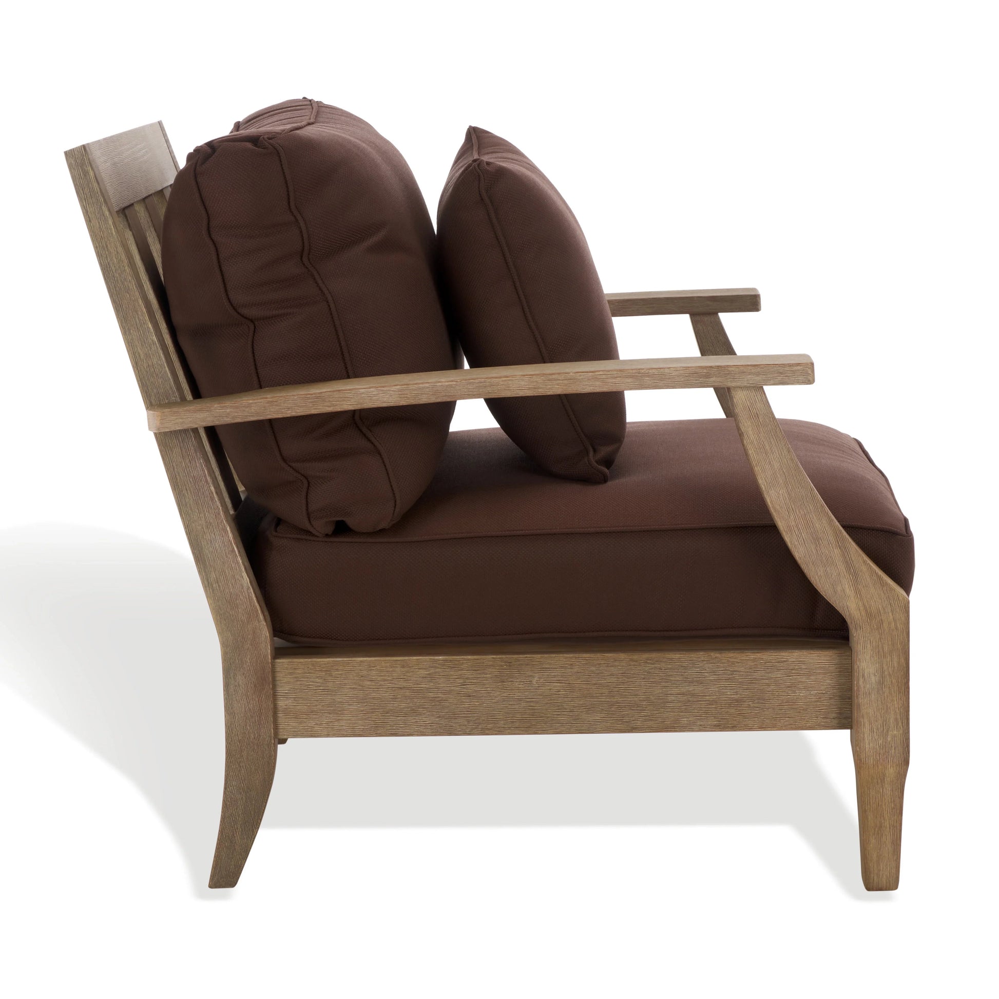 Bring timeless colonial charm to your outdoor space with the Martinique Wood Patio Armchair. Crafted from natural eucalyptus wood, it features a slatted back and angled design for both style and comfort. The soft Olefin upholstered cushion enhances relaxation, making it ideal for patios, porches, or garden settings. Assembly required.