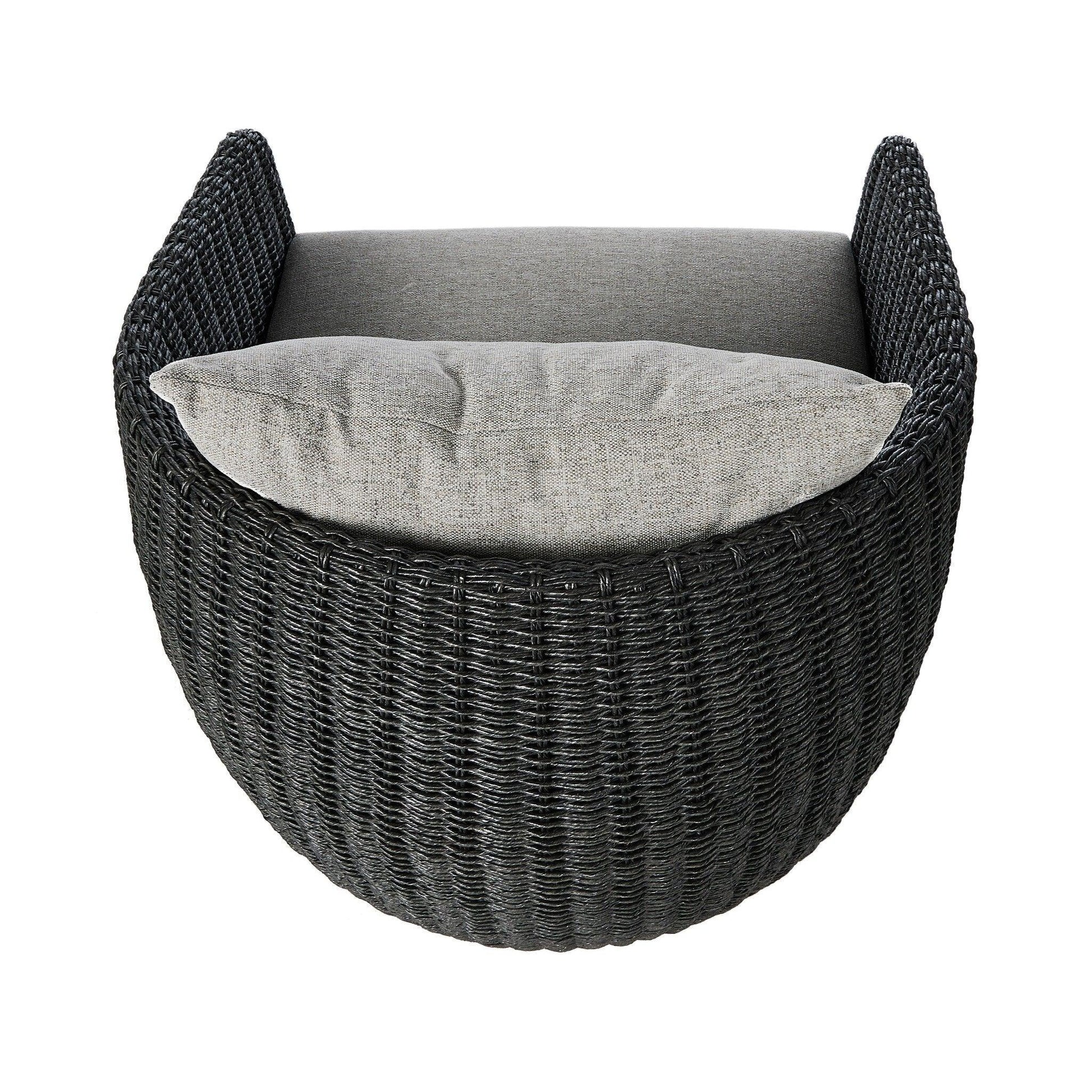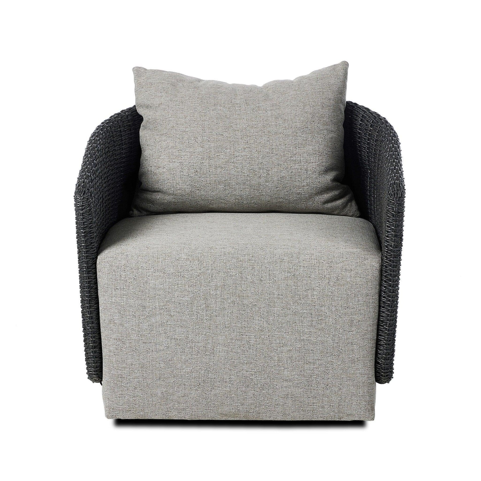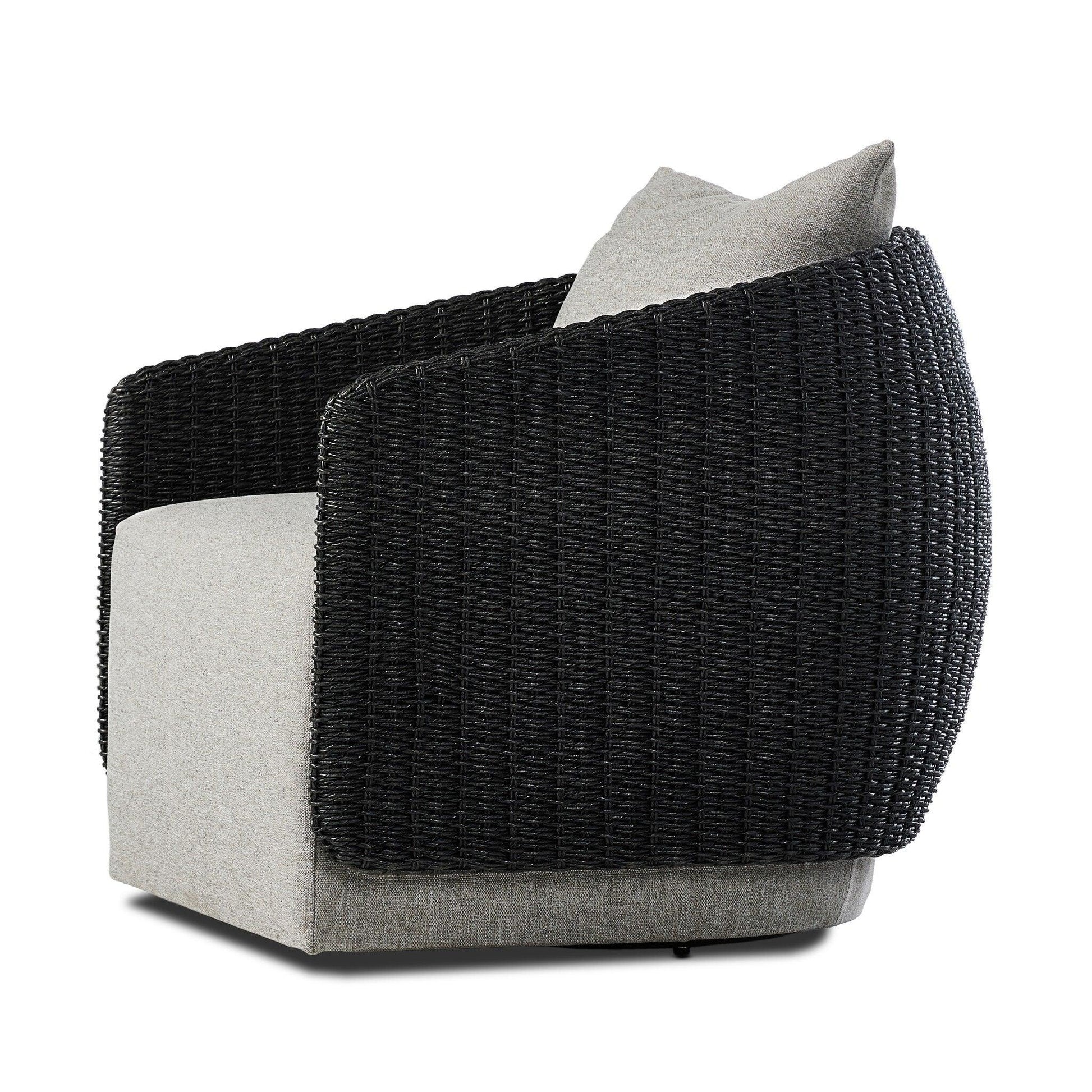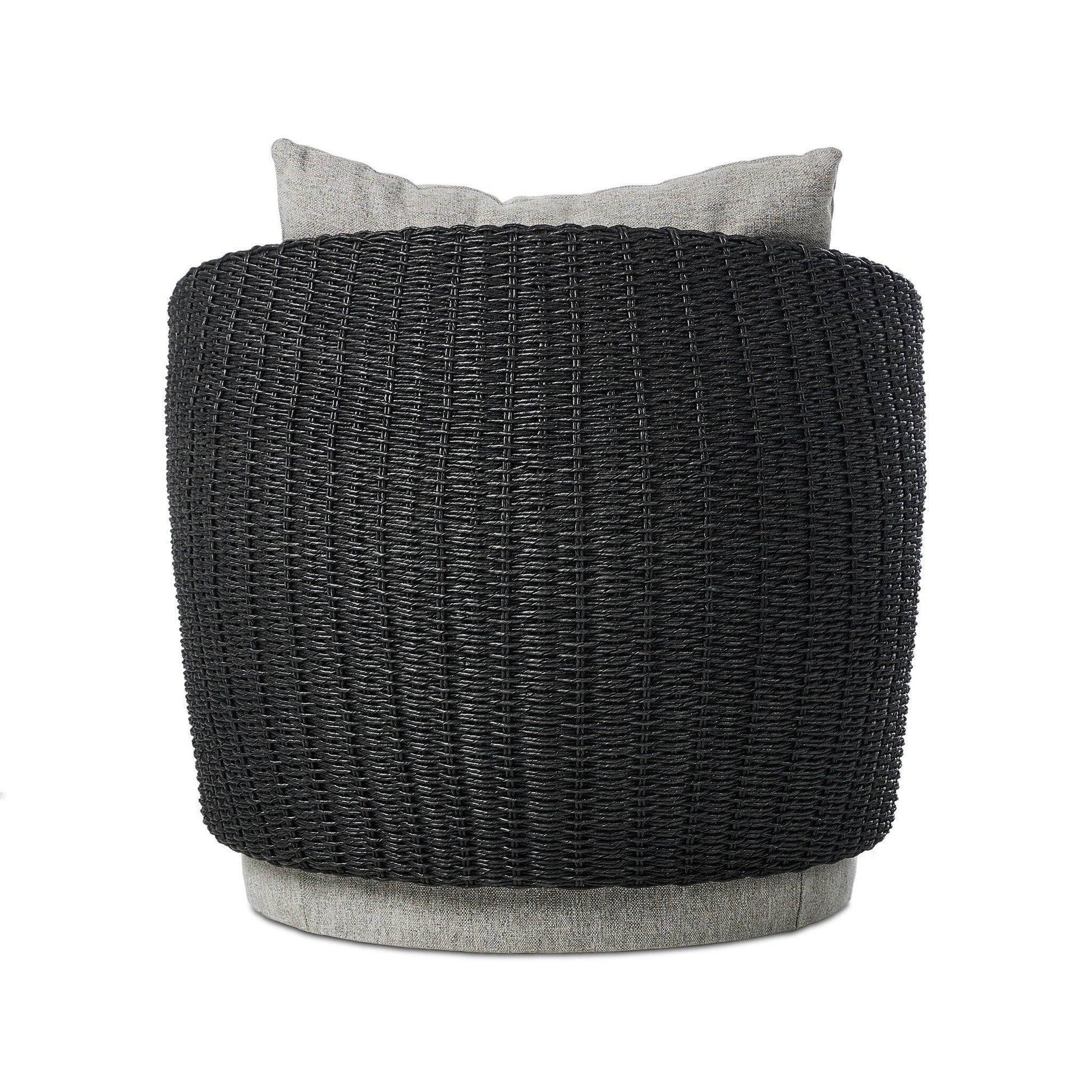 Sustainably made with zero waste luxurious Italian upholstery places a new and unique spin on indoor/outdoor seating offering soft durable fabric that's highly resistant to sun stains mold and abrasion. Shell framing in black faux-hyacinth weaves for extra texture atop a 360-degree swivel. Cover or store indoors during inclement weather and when not in use.