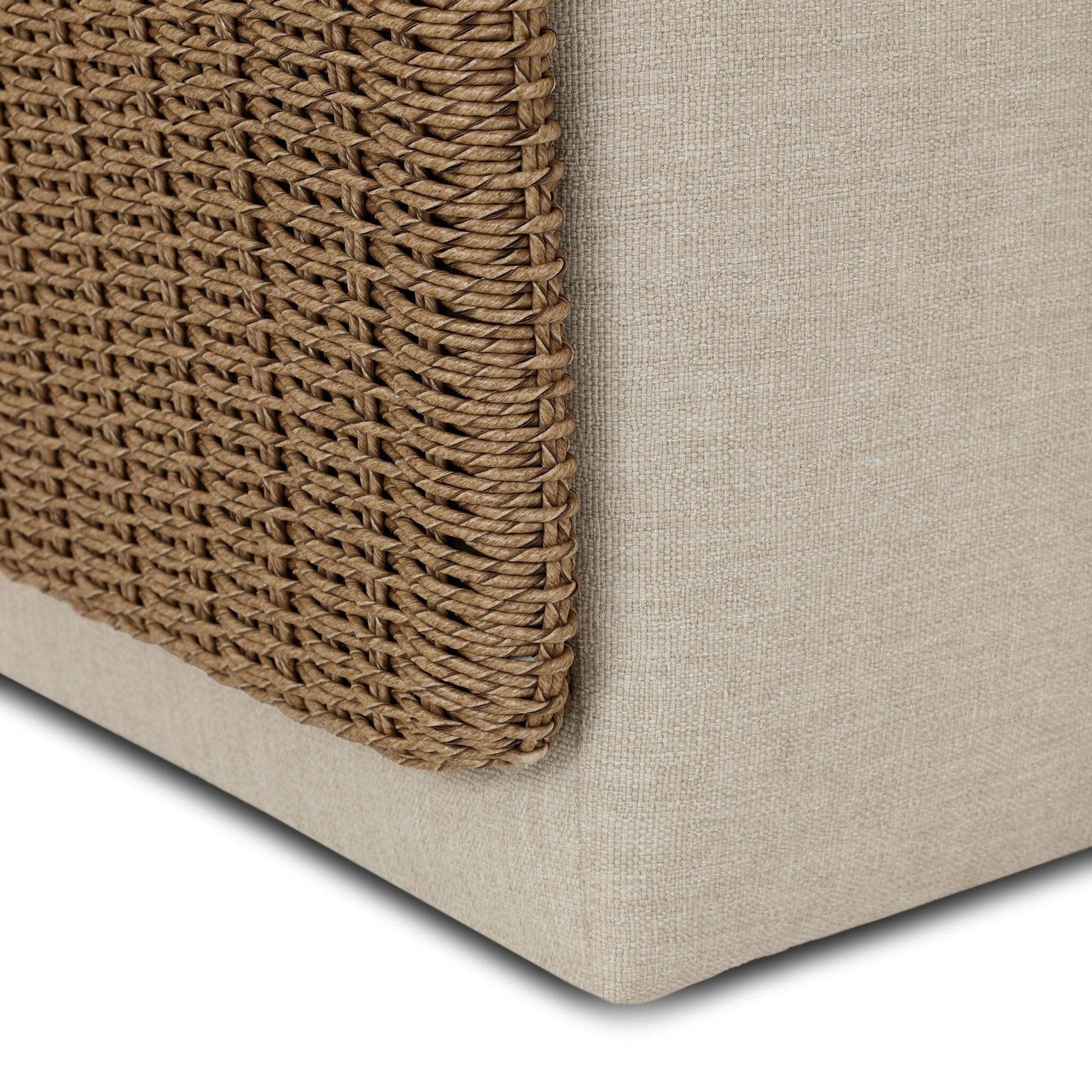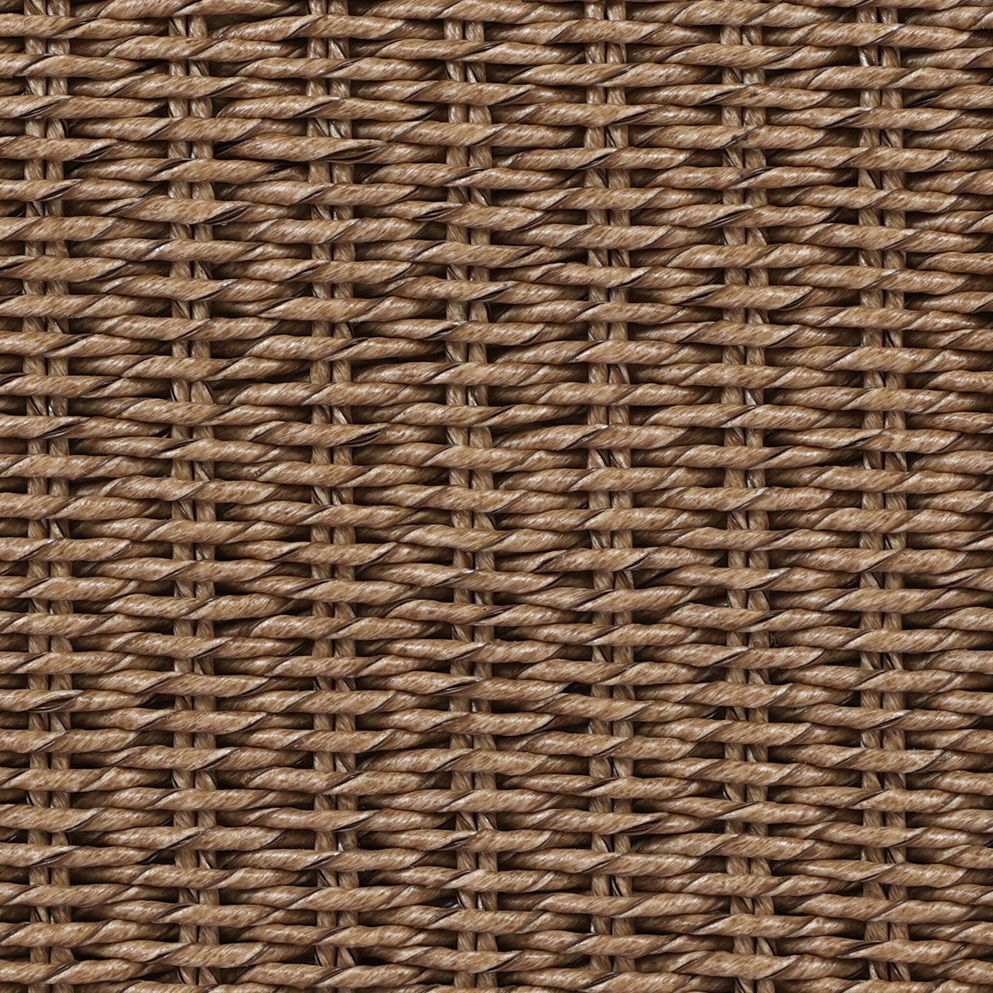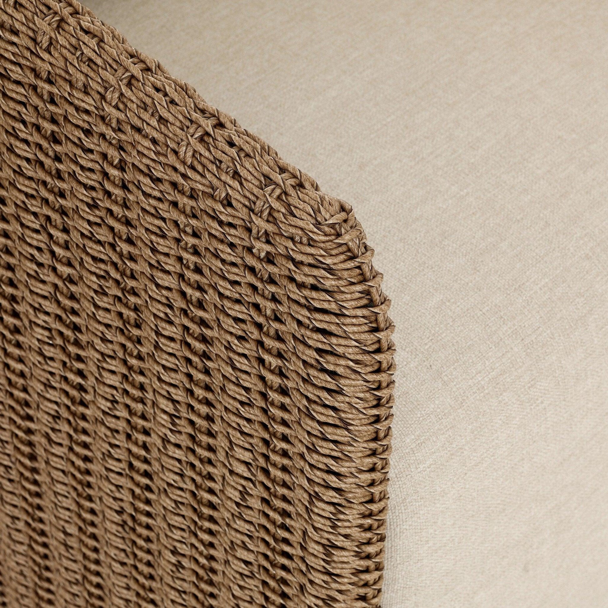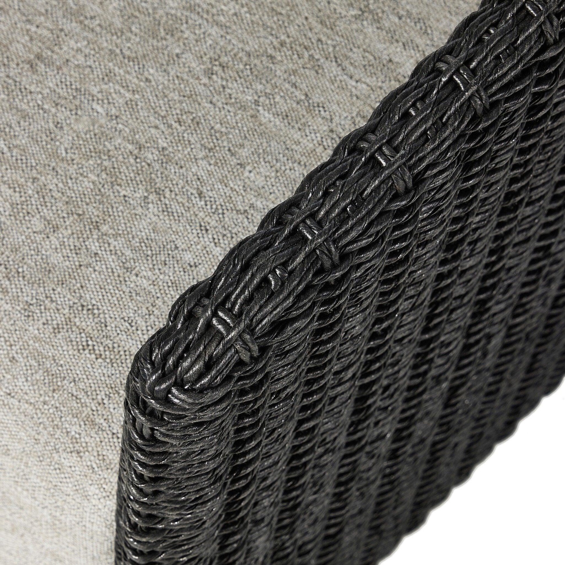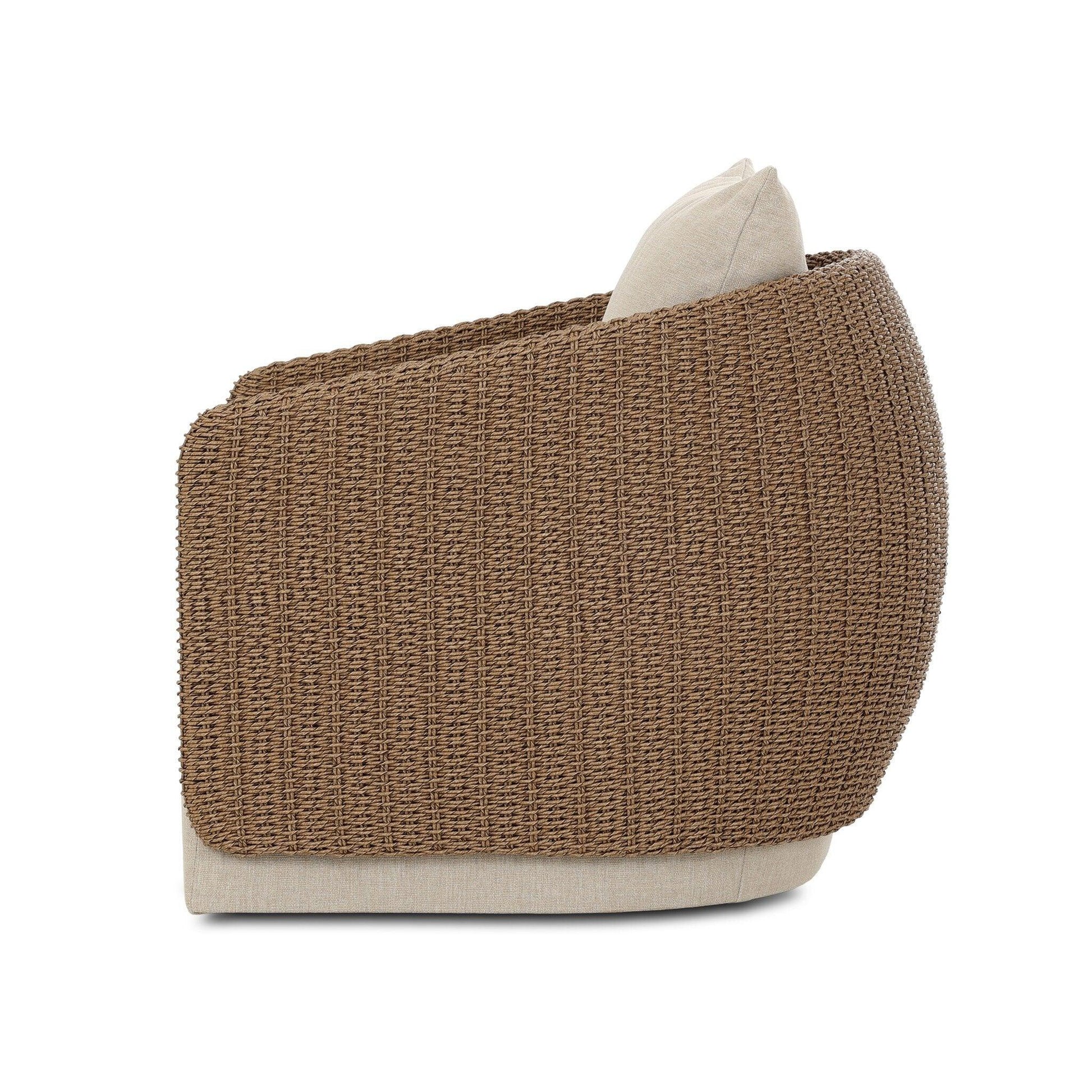 Sustainably made with zero waste luxurious Italian upholstery places a new and unique spin on indoor/outdoor seating offering soft durable fabric that's highly resistant to sun stains mold and abrasion. Shell framing in black faux-hyacinth weaves for extra texture atop a 360-degree swivel. Cover or store indoors during inclement weather and when not in use.