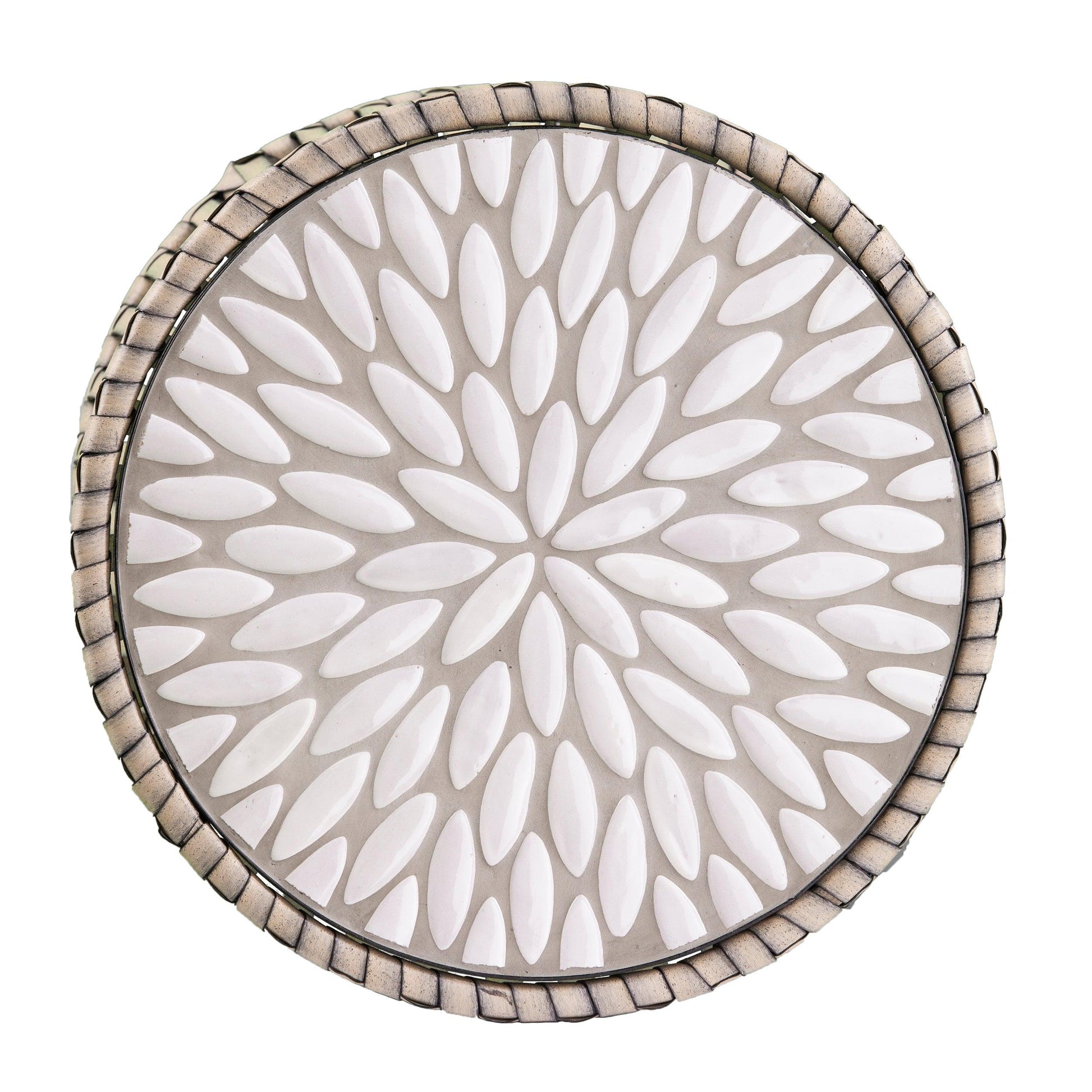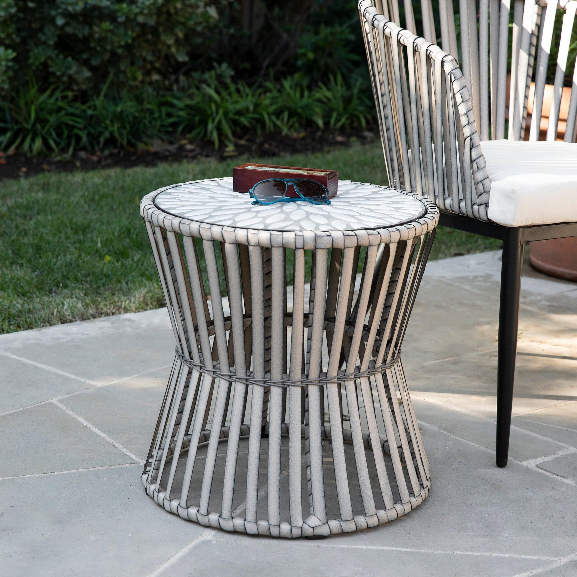 Weave a contemporary design with this outdoor accent table. A sturdy, all-weather frame rounds out your patio setup, while poly rattan straps string together a textured, natural look. A scattered ceramic petal pattern decorates the spacious tabletop, crafting a unique mosaic design and updating your poolside oasis. Slide this ceramic-top end table onto your deck to collect party drinks and snacks, or add alongside your outdoor sofa as a sophisticated plant stand.
