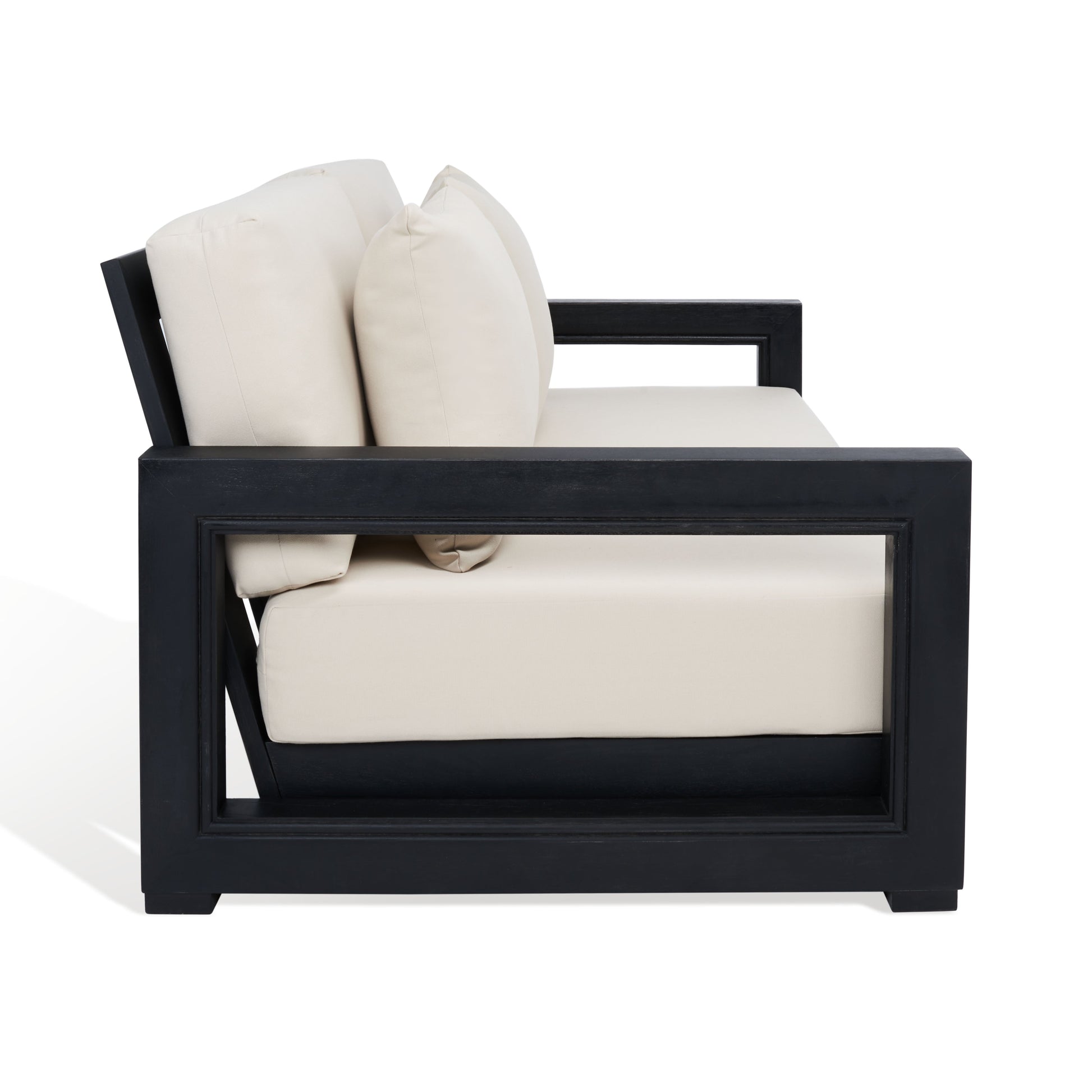 Sit down, relax, and unwind in this cozy Montford Loveseat. Styled with contemporary cut-out arms in sleek black metal and plush beige upholstery, designers use them in pairs for an instant outdoor conversation area.
