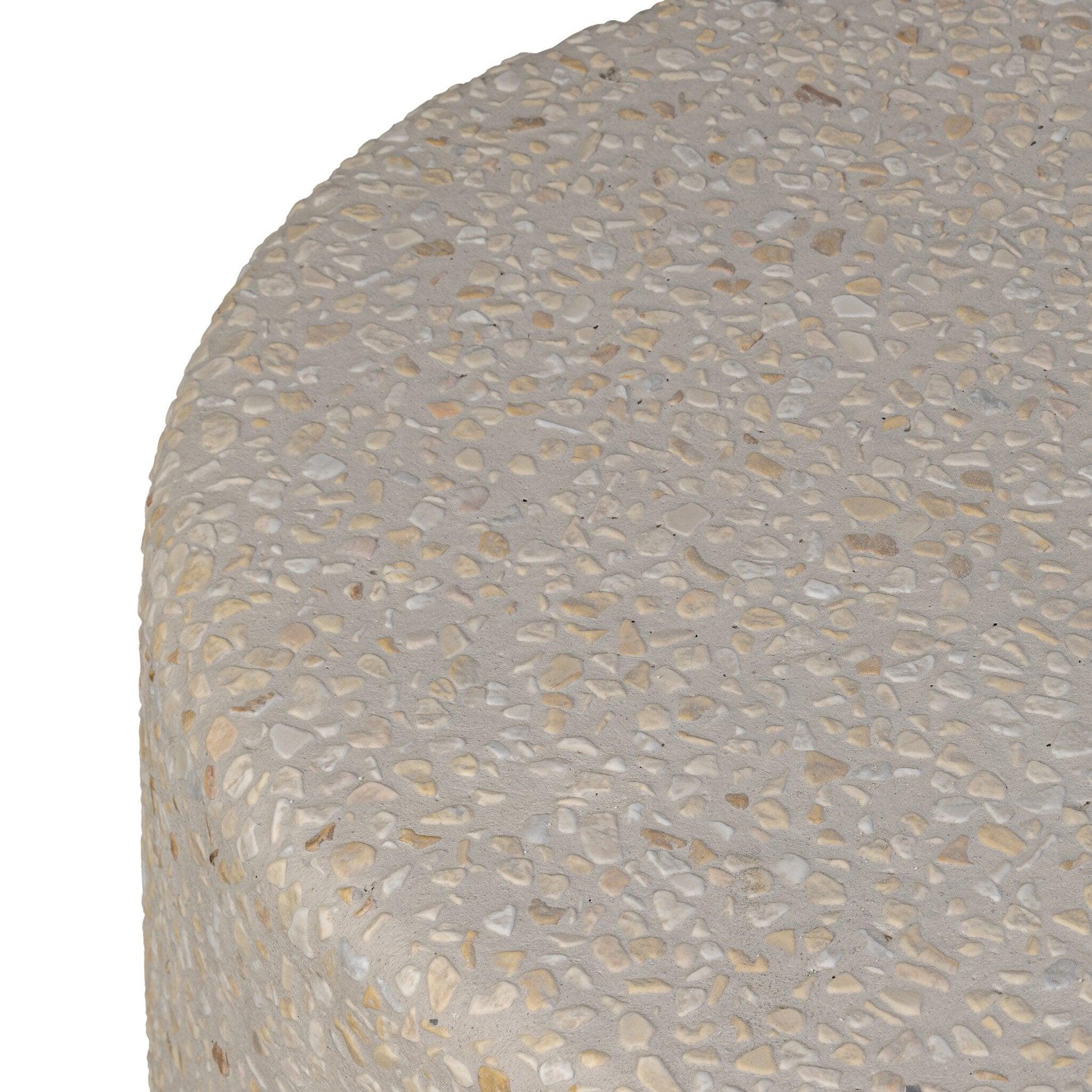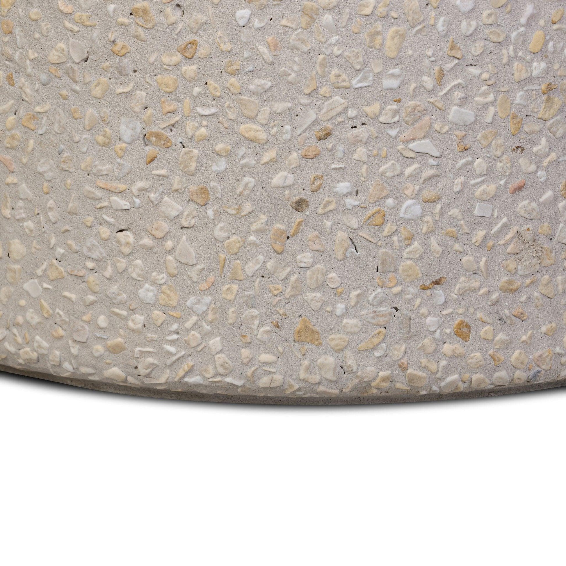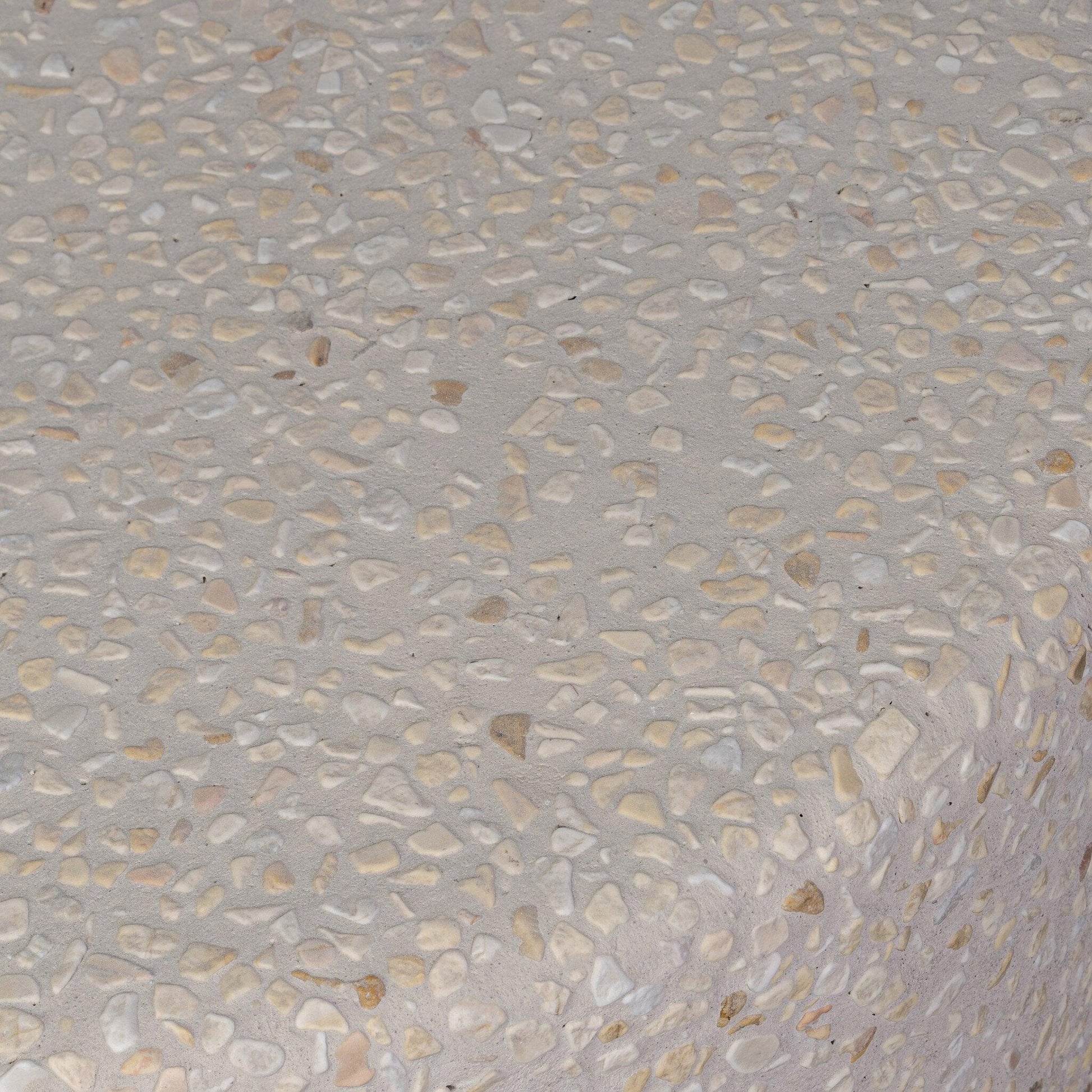 Natural stones form a neutral terrazzo pattern on a cream base bringing a sense of texture and depth to this versatile coffee table. Designed with a clean rounded silhouette it works effortlessly in both indoor and outdoor spaces. Cover or store indoors during inclement weather and when not in use.
