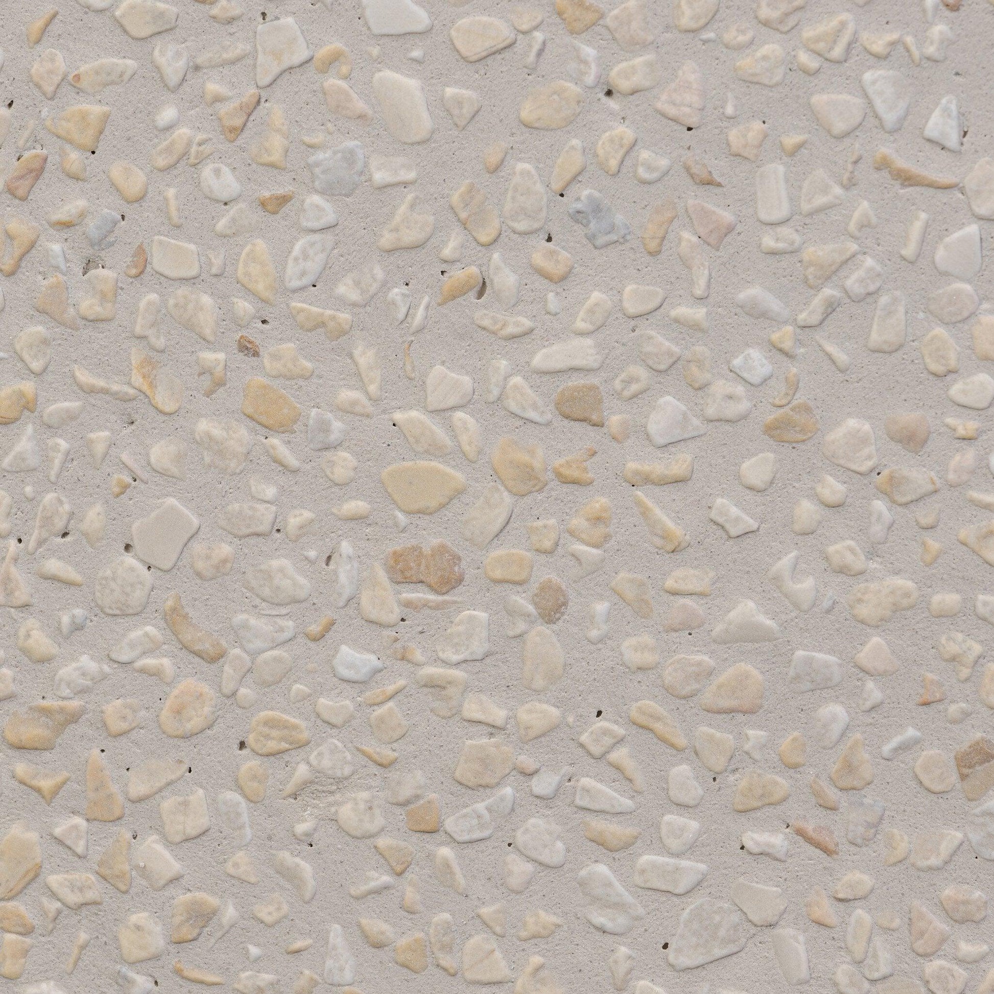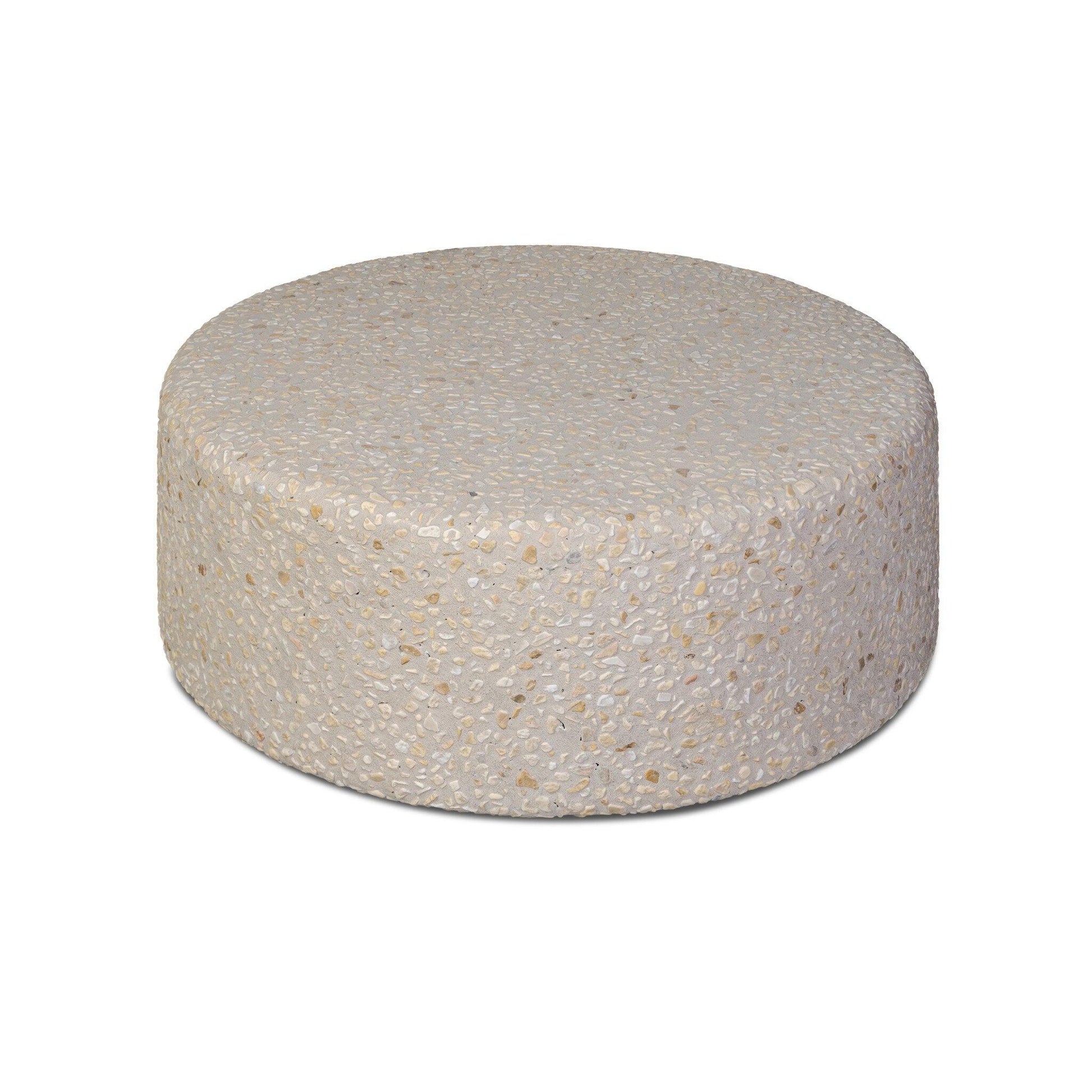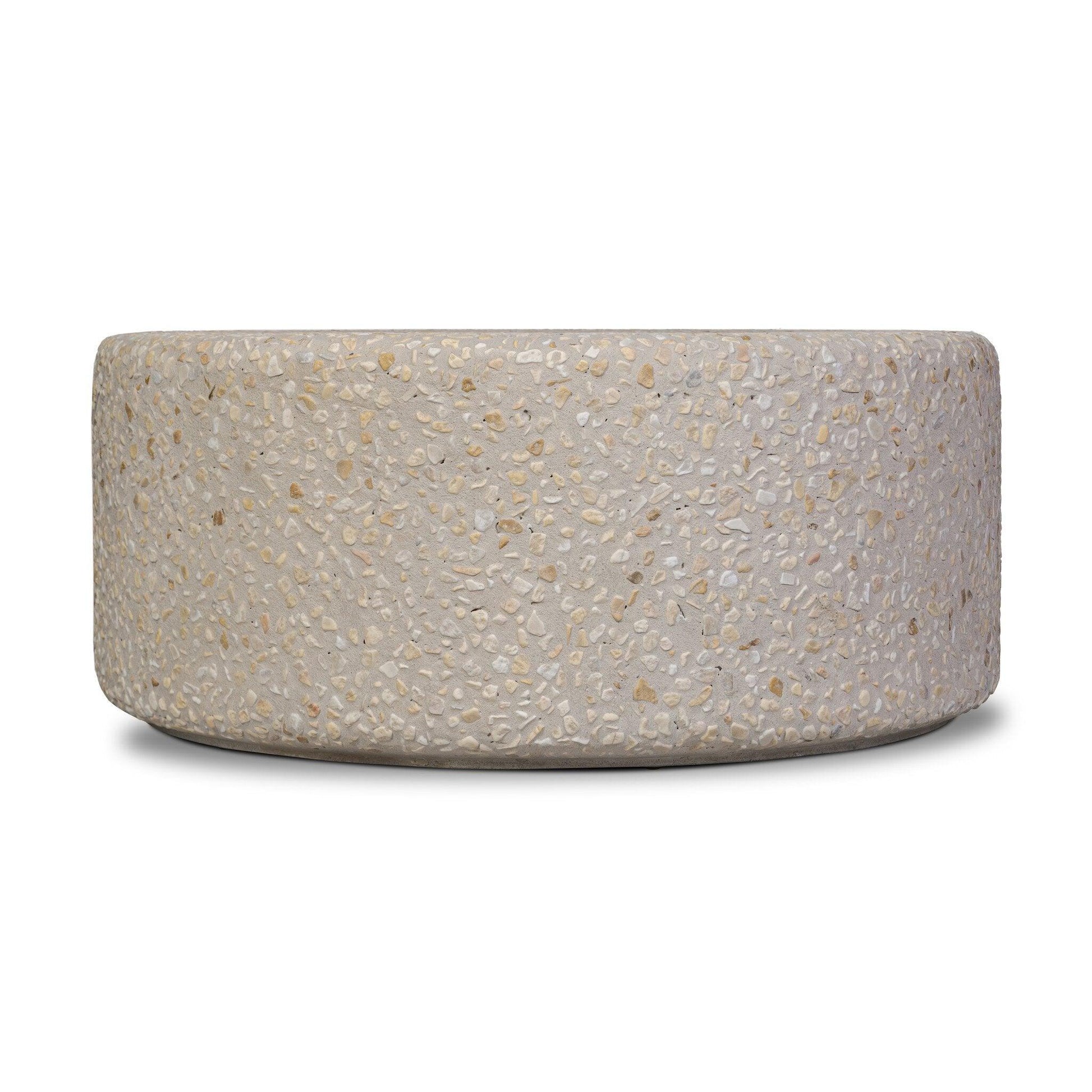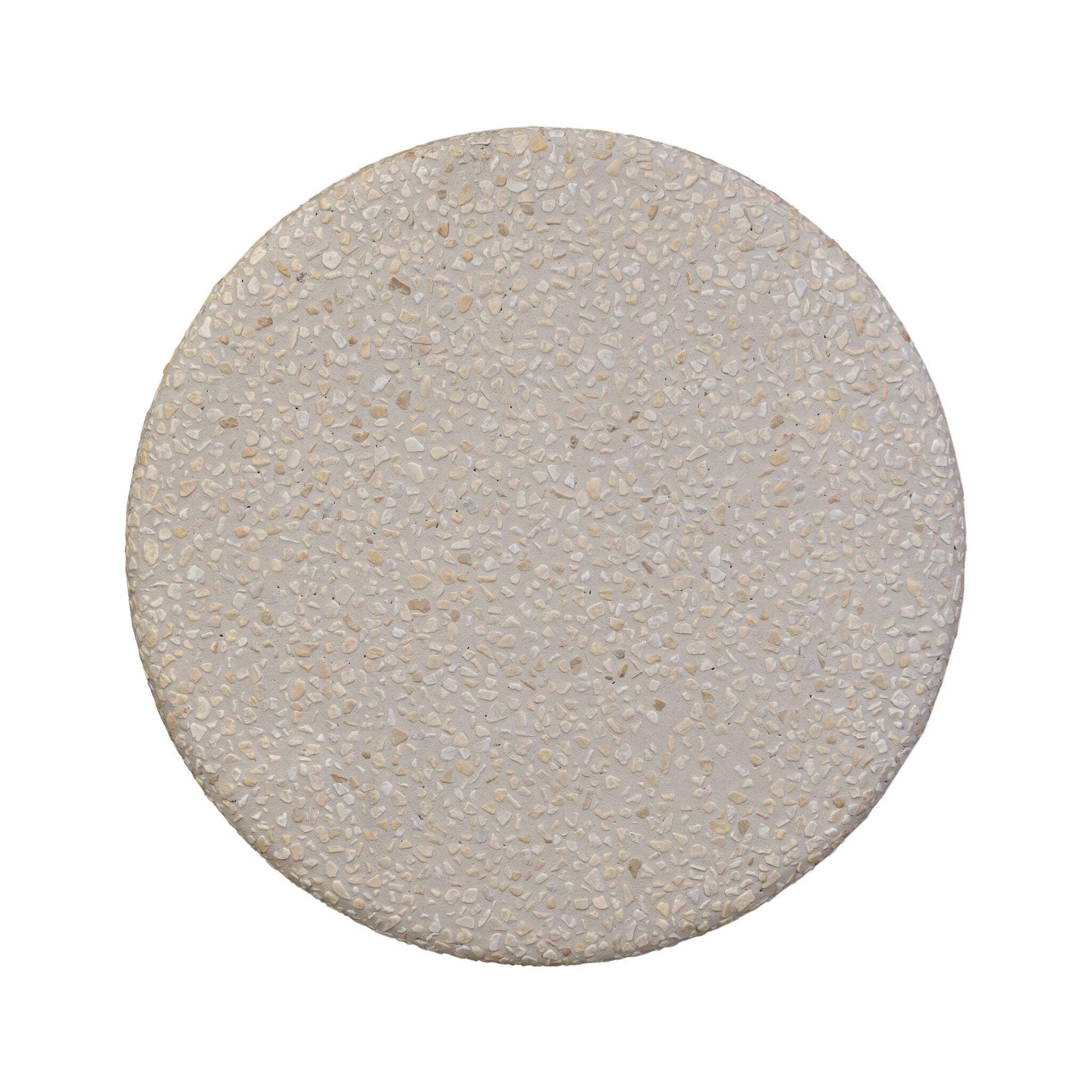 Natural stones form a neutral terrazzo pattern on a cream base bringing a sense of texture and depth to this versatile coffee table. Designed with a clean rounded silhouette it works effortlessly in both indoor and outdoor spaces. Cover or store indoors during inclement weather and when not in use.