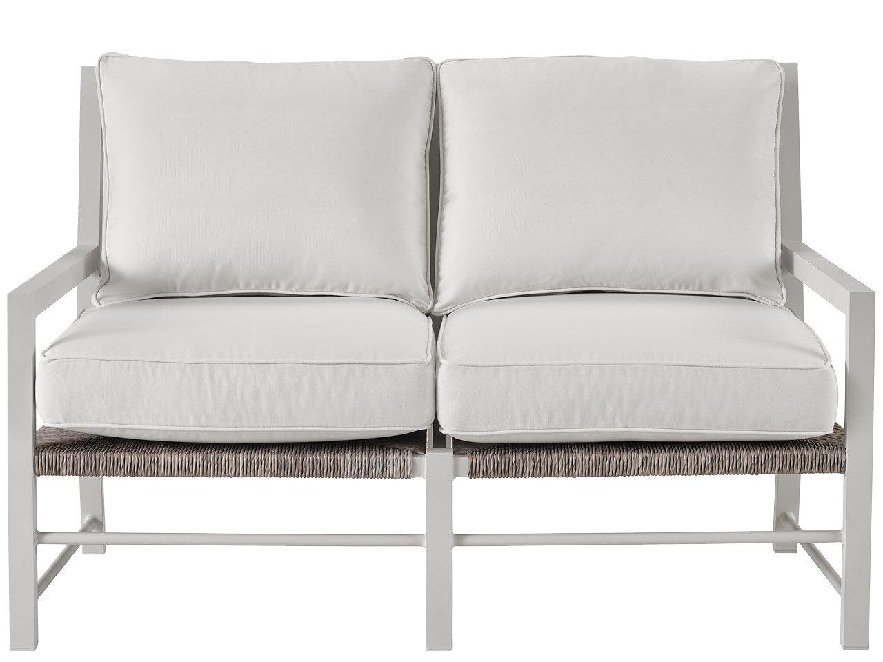 Modern with a touch of coastal flair, the Tybee Loveseat includes greige wicker detailing, a crisp white frame, and plush upholstered cushions.