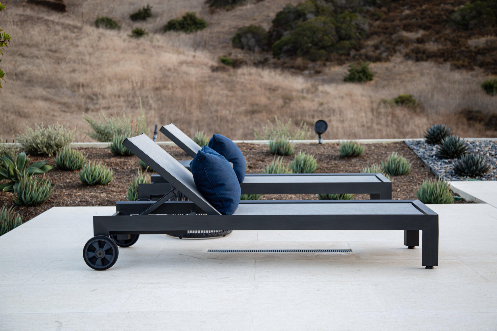 The Redondo Sling Chaise blends modern and industrial sensibly into one striking design, featuring an armless linear frame and Dark Grey sling seat. Crafted in powder-coated aluminum with a hand-brushed Slate finish, this chaise offers 5 adjustable positions for customized