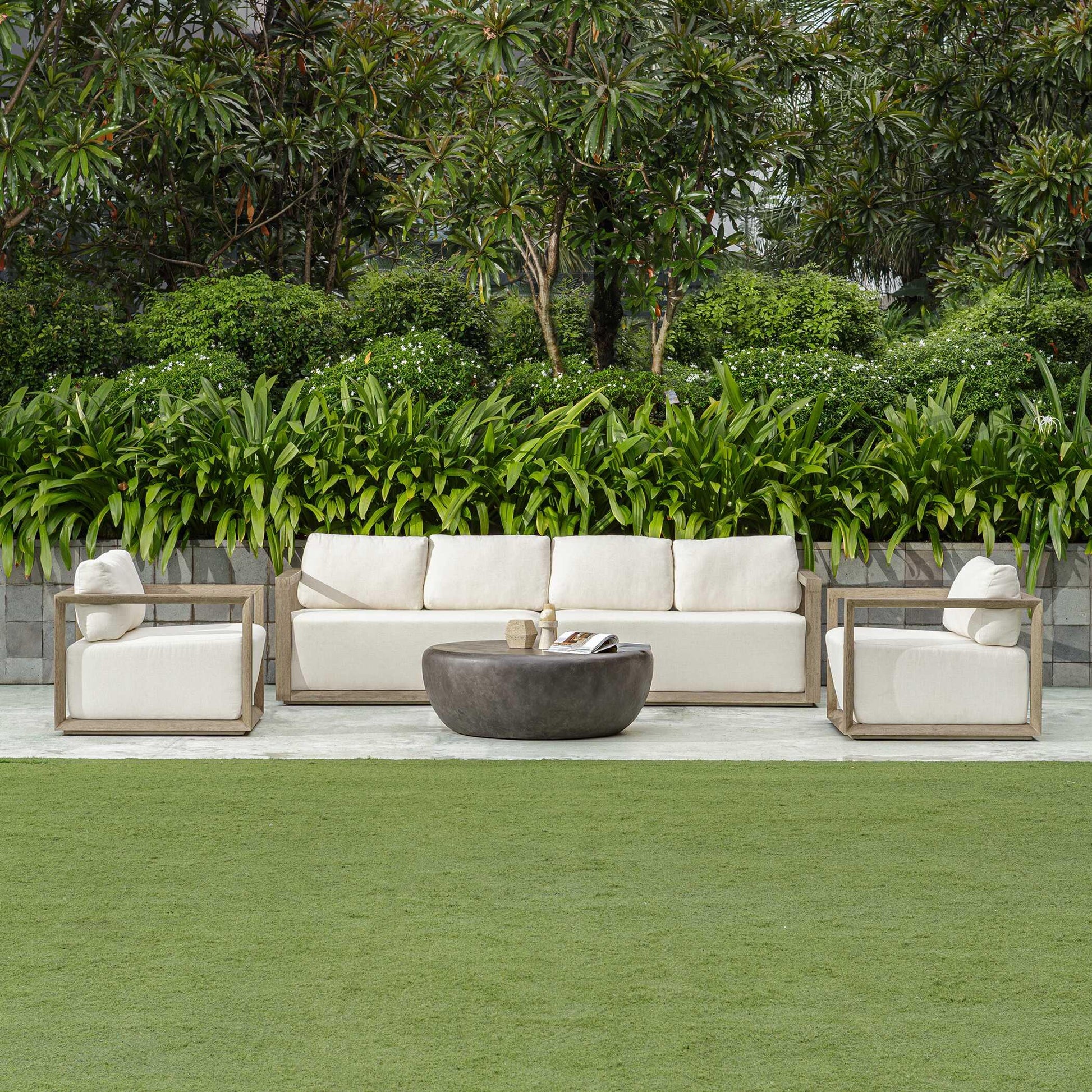 The Remsen Outdoor Lounge Chair Features A Striking Architectural Frame With Smooth Interior Curves That Give A Sculptural Presence. Constructed Of Solid Mahogany Wood In A Weathered Gray Finish With Wire-brushed Details. Its Generously Cushioned Floating Seat, Upholstered In An Oyster White Solution Dyed Acrylic Fabric, Is Designed To Withstand The Moisture And Dirt That Comes With Outdoor Use. Solid Wood Will Continue To Move With Temperature And Humidity Changes, Which Can Result In Cracks And Uneven Surfaces, Adding To Its Authenticity And Character.