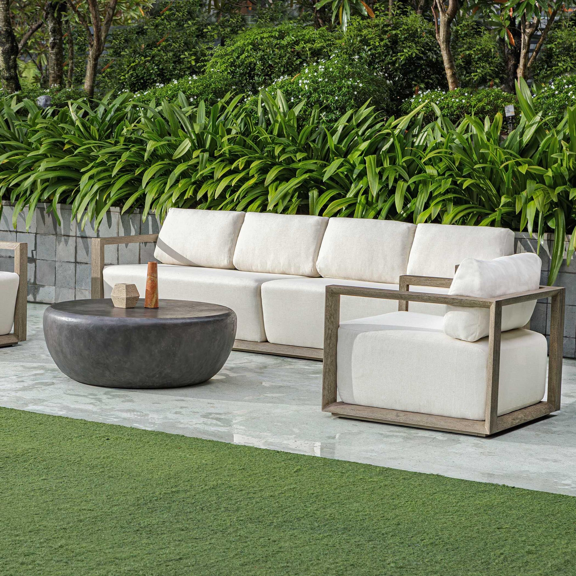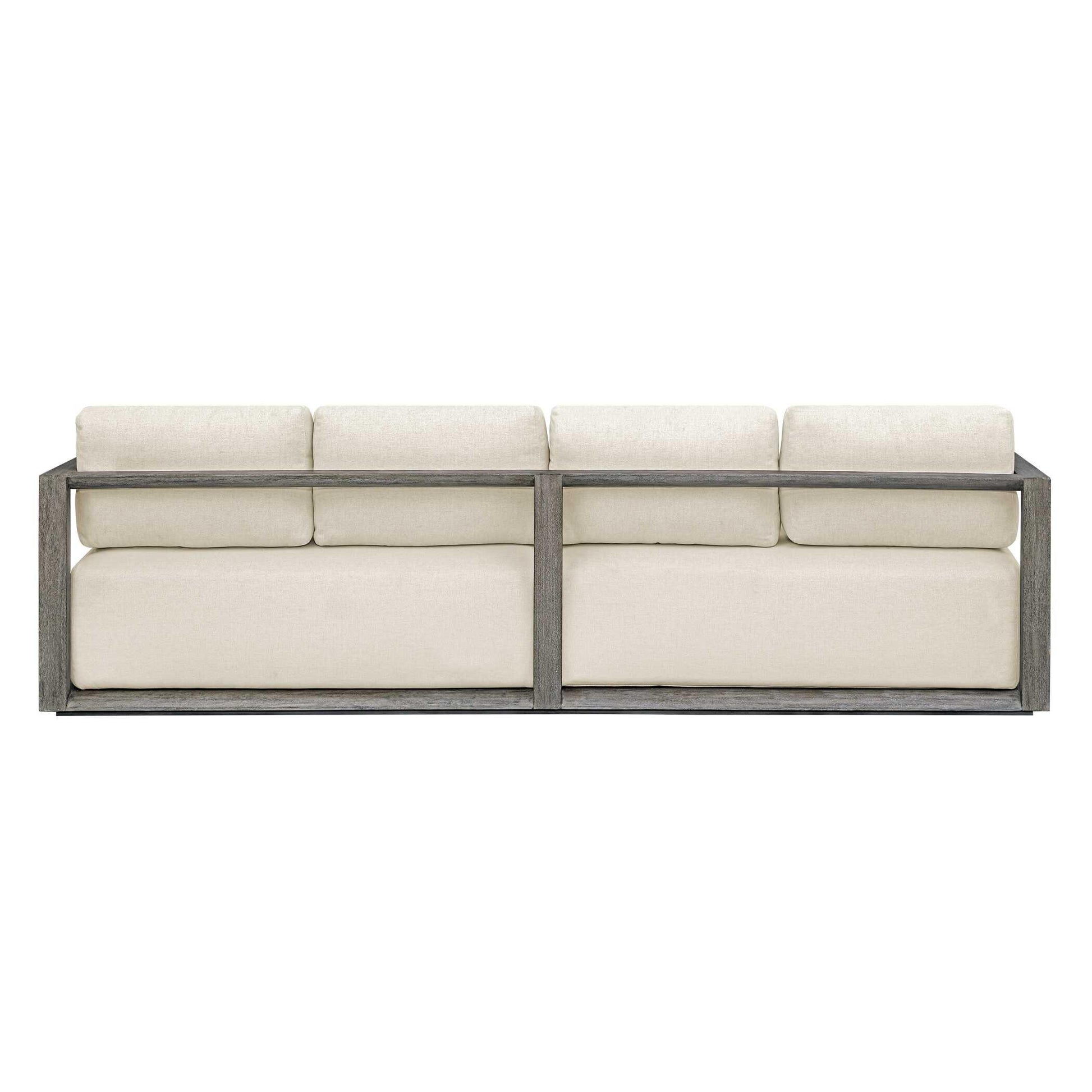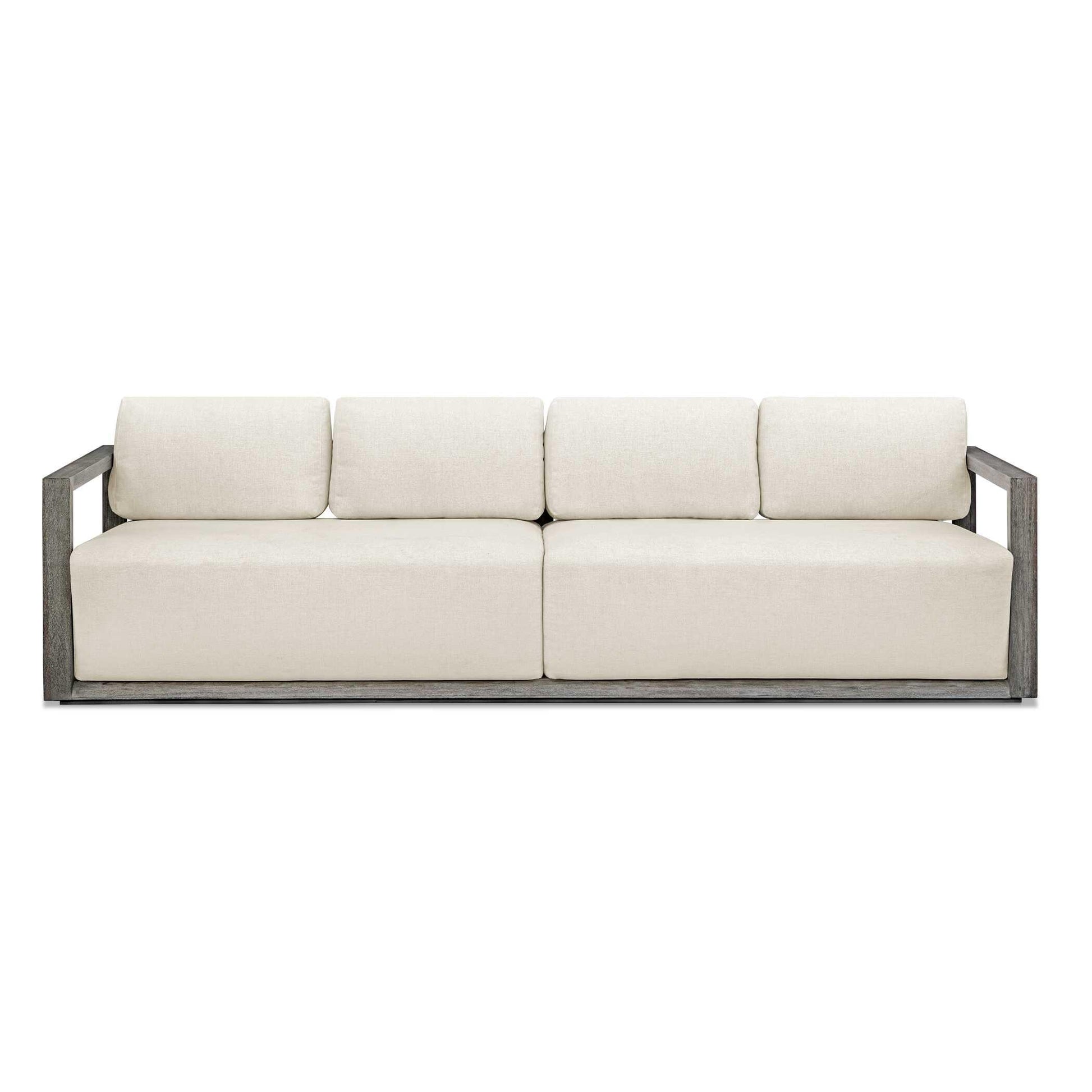 The Remsen Outdoor Sofa Features A Striking Architectural Frame With Smooth Interior Curves That Give A Sculptural Presence. Constructed Of Solid Mahogany Wood In A Weathered Gray Finish With Wire-brushed Details. Its Generously Cushioned Floating Seat, Upholstered In An Oyster White Solution Dyed Acrylic Fabric, Is Designed To Withstand The Moisture And Dirt That Comes With Outdoor Use. Solid Wood Will Continue To Move With Temperature And Humidity Changes, Which Can Result In Cracks And Uneven Surfaces, Adding To Its Authenticity And Character.