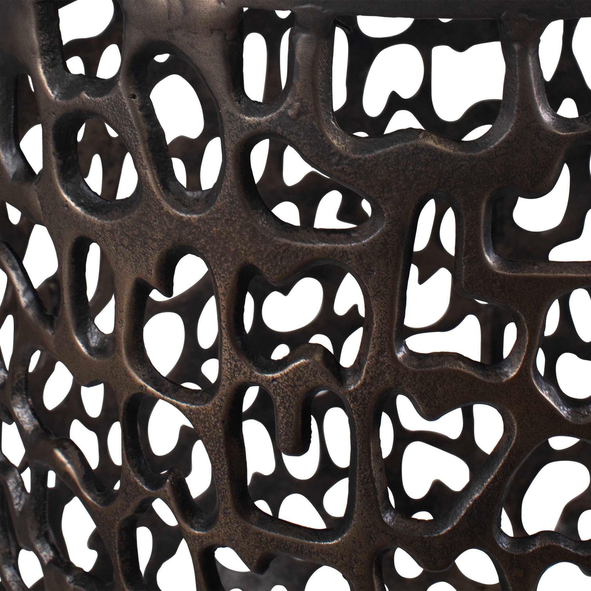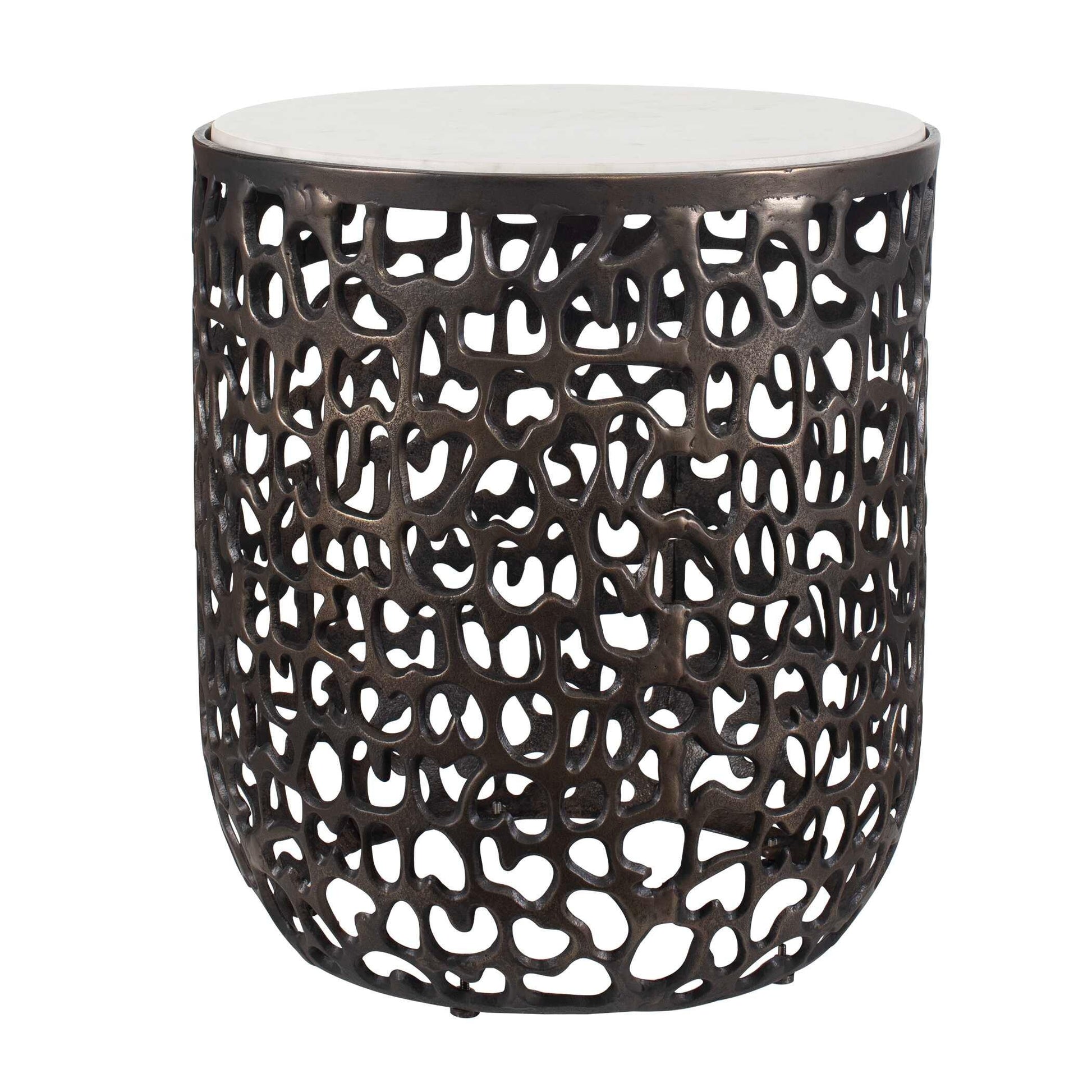 This Striking Side Table Boasts A White Marble Top With Subtle Gray Veining, Creating A Luxurious Contrast With The Warm, Dark Bronze Finish Of Its Intricately Patterned Cast Aluminum Base. Due To The Nature Of Natural Stone, Every Piece Will Vary Slightly Ensuring Yours Is Unique. Suitable For Both Indoor And Outdoor Use.